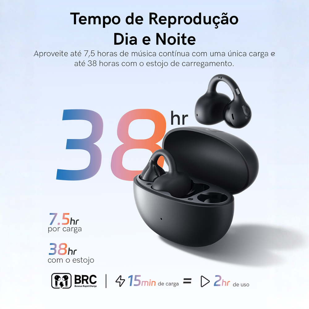 📌 Fone Sem Fio Baseus Bass BC1 – Open-Ear Earclip Bluetooth 6.0 O Baseus Bass BC1 é o fone perfeito para quem busca conforto extremo, segurança ao ouvir o ambiente e qualidade sonora premium em qualquer situação. O design open-ear com encaixe “clip-on” garante liberdade total, sem pressão no ouvido e sem isolamento excessivo — ideal para treinos, corridas, uso urbano, trabalho e para quem usa óculos. 🌀 Design Open-Ear com Clip Tri-Curve Não entra dentro do ouvido Confortável por horas, leve e firme Ideal para quem sente desconforto com fones intra-auriculares Perfeito para quem usa óculos ou capacete 🪶 Ultraleve – Apenas 5,3 g por lado Quase imperceptível, ideal para longos períodos de uso sem incomodar. 🎵 Qualidade de Som Premium Drivers Dinâmicos de 12 mm com diafragma bio-cellulose AI Bass Boost: graves fortes, vocais claros e agudos nítidos Som Direcionado: reduz vazamento de áudio, ótimo para ambientes públicos 🎤 Chamadas Claras com IA 4 microfones com cancelamento de ruído por IA Voz mais limpa e precisa em ligações Ótimo para reuniões, chamadas externas e ambientes barulhentos 🔗 Conectividade Inteligente Bluetooth 6.0: conexão rápida, estável e eficiente Multiponto: conecta a dois dispositivos ao mesmo tempo Botões físicos: comandos precisos sem toques acidentais 🔋 Autonomia Poderosa 7,5 horas de uso contínuo por carga 38 horas totais com estojo Carregamento Rápido USB-C: 15 min = até 2 horas de uso 💧 Resistente para o Dia a Dia IP55: resistente ao suor, respingos e poeira Ideal para academia, corrida, ciclismo, caminhadas e uso ao ar livre 📦 Conteúdo da Embalagem 2x Fones Baseus BC1 Estojo de carregamento Cabo USB-C Manual e documentação ✔️ Loja Oficial Baseus Brasil na Shopee ✔️ Produto Original, Novo e Lacrado ✔️ Homologado pela ANATEL ✔️ Garantia oficial de 12 meses ✔️ Emitimos Nota Fiscal