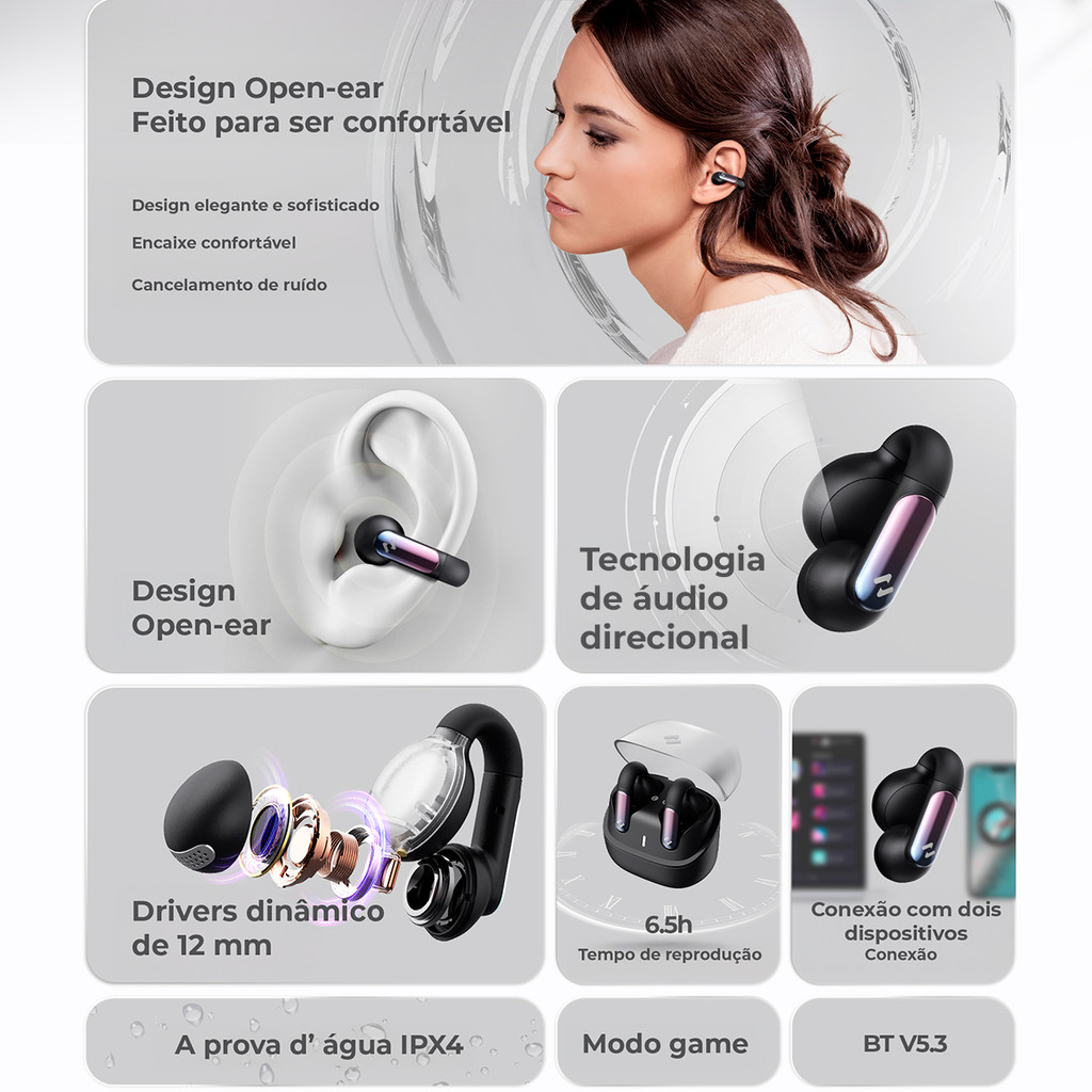 Fones de Ouvido OPENBUDS1 Bluetooth HAVIT TW980 Bluetooth 5.3 Multiponto - Som de Alta Qualidade e Longa Duração de Bateria Áudio de Alta Qualidade com Mic Único ENC: Experimente um som cristalino com os Fones de Ouvido Havit TW980, equipados com a tecnologia de Cancelamento de Ruído Ambiental (ENC) no microfone. Esses fones sem fio proporcionam áudio de alta definição para música e chamadas, oferecendo uma experiência imersiva e conectividade sem interrupções com o Bluetooth 5.3. Bateria Duradoura para Uso Durante o Dia Todo: Com uma bateria de 40mAh em cada fone e uma case de carregamento de 400mAh, os fones Havit TW980 garantem até 6.5 horas de reprodução contínua e até 5 horas de tempo de conversação. Seu design compacto e excelente autonomia de bateria tornam esses fones perfeitos para uso durante o dia, seja no trabalho, na academia ou em viagens. Design Confortável e Leve: Projetado para oferecer máximo conforto, os fones de ouvido sem fio Havit TW980 acompanham várias opções de tampões auriculares, garantindo um ajuste seguro para todos os usuários. Cada fone pesa apenas 4,1g, tornando-os leves e ideais para uso prolongado sem desconforto. Qualidade de Som Aprimorada com Driver de 12mm: Equipado com um driver de 12mm e sensibilidade de 117dB, os fones Havit TW980 oferecem som potente e graves profundos. Seja para ouvir música, realizar chamadas ou jogar, esses fones sem fio proporcionam uma excelente qualidade de áudio com uma ampla resposta de frequência de 20Hz a 20KHz. Design Compacto e Portátil com Carregamento Tipo-C: Os fones de ouvido Havit TW980 vêm com um estojo de carregamento compacto, que cabe facilmente no bolso. A porta de carregamento Tipo-C garante um carregamento rápido e eficiente, tornando esses fones ideais para o uso diário, viagens e treinos. Especificações: - Tipo de uso: Tipo Aberto ou Open-ear - Tecnologia ENC (Redução de Ruídos em Chamadas) - Prompt de voz: Sim - Microfone: Sim - Versão Bluetooth: 5.3 - Perfil BT: A2DP/AVRCP/HFP - Faixa de operação: 10m - Frequência: 2,4 GHz-2,480 GHz - Tamanho do driver do alto-falante: 12mm - Impedância: 32±15% - Resposta de frequência: 20Hz~20KHz - Sensibilidade dos fones de ouvido: 96±3dB a 1KHz - Resposta do microfone: -42±3dB - Bateria dos fones: 40mAh - Tempo de Reprodução: 6.5h com volume a 60% (23h com o estojo, a 60% Vol.) - Entrada de carregamento: DC5V-1A USB-C - Tempo de carregamento: 2h - Impedância: 32 Ohm - Resistência: 32 Ohm - Sensibilidade: 96 dB Conteúdo da Caixa: 1x Fones de Ouvido Bluetooth Havit TW980 OPENBUDS1 1x Estojo de Carregamento com cabo USB-C 1x Manual do Usuário