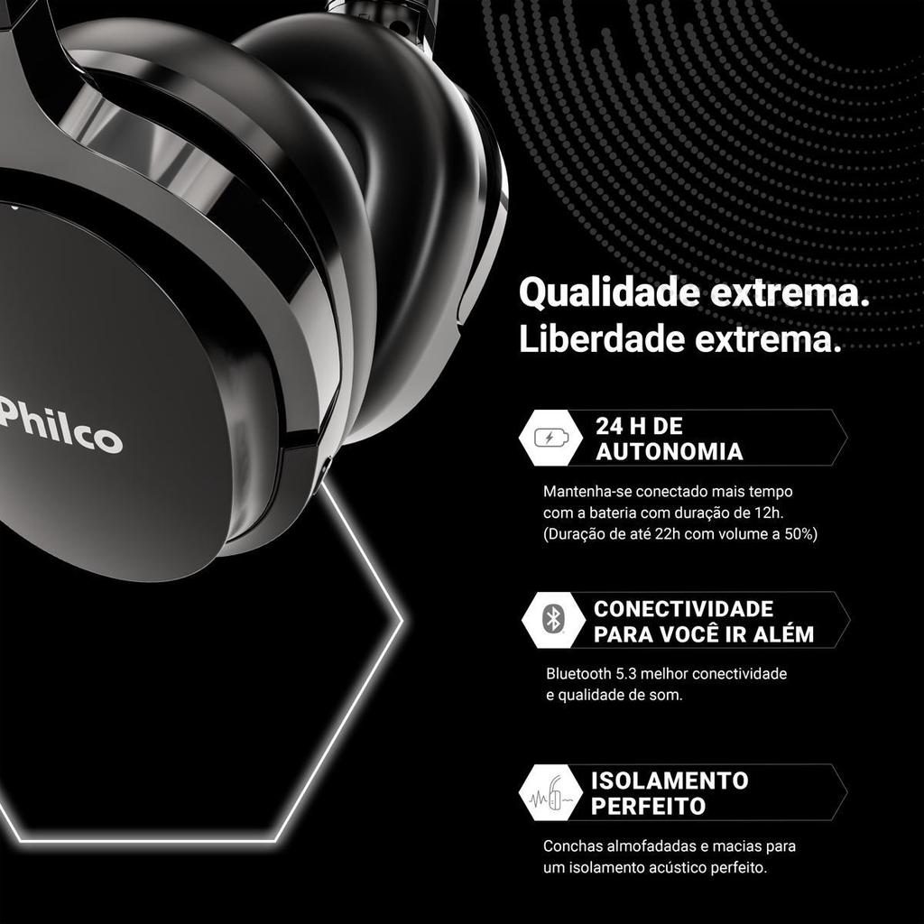 Descubra o Fone de Ouvido Headphone Philco Extreme Bluetooth PFO01BTP, ideal para quem busca conforto, praticidade e qualidade sonora no dia a dia. Seu design ergonômico se ajusta perfeitamente às orelhas, garantindo uso prolongado com muito mais bem-estar. Os drivers de 40 mm entregam áudio potente e imersivo, com 150 mW de potência para deixar suas músicas, vídeos e chamadas ainda melhores. Com a tecnologia Bluetooth 5.3, você ganha mais alcance, estabilidade e rapidez na conexão com o smartphone. E se quiser variar, o Headphone Philco Extreme também conta com rádio FM, entrada para cartão de memória e opção de cabo auxiliar P2. A bateria de 400 mAh proporciona até 12 horas de reprodução contínua, permitindo que você escute o que quiser, onde estiver, sem se preocupar em recarregar. Com microfone integrado e controles no próprio fone, você gerencia chamadas e músicas com muito mais facilidade. Perfeito, completo e confortável, o Fone de Ouvido Headphone Philco Extreme Bluetooth PFO01BTP acompanha todos os seus momentos com qualidade e liberdade. Arco ajustável e conchas almofadadas Drivers de 40 mm com 150 mW de potência Conectividade Bluetooth 5.3 Bateria de 400 mAh com até 12 horas de reprodução Microfone integrado com controle remoto Funções rádio FM, cartão de memória e modo Bluetooth Entrada auxiliar P2 para uso com fio Entrada micro USB-C para carregamento Imãs de neodímio Acabamento leve e emborrachado.