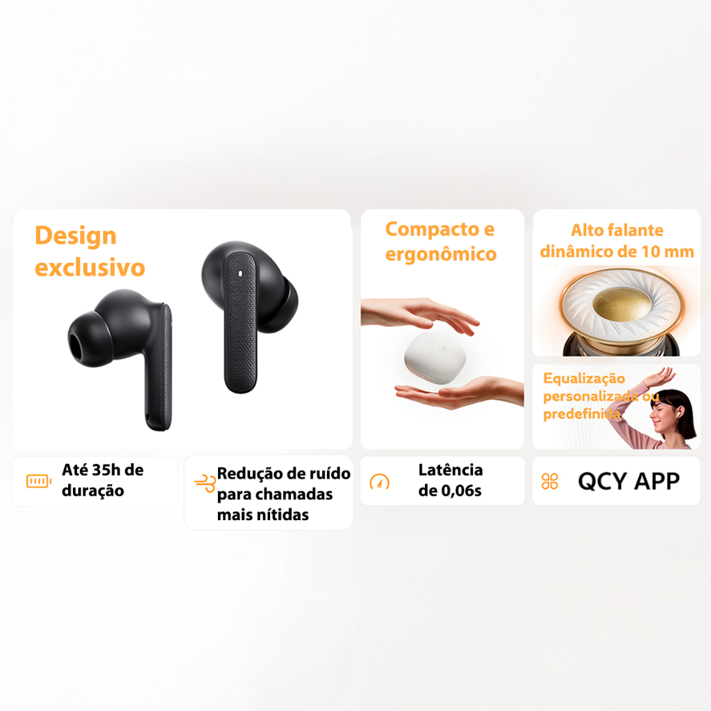 Fone de Ouvido QCY Buds T43 Sem Fio Bluetooth 5.3, Modo Baixa Latência, Certificado IPX4, até 35 Horas de Bateria