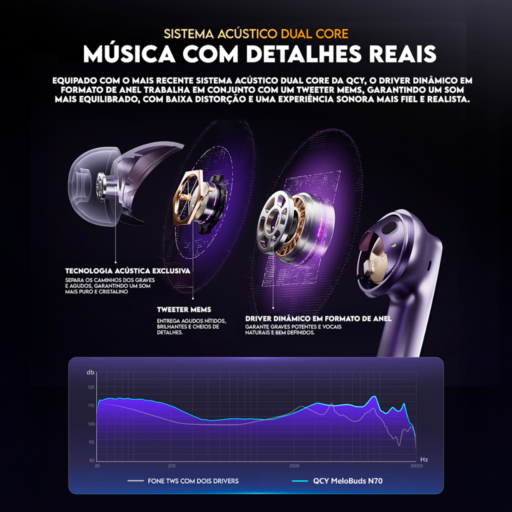 SOMOS A LOJA OFICIAL DA QCY NO BRASIL E IMPORTADORES OFICIAIS NA AMÉRICA LATINA Envio Nacional: Este produto é enviado diretamente do centro de distribuição da Shopee, garantindo rapidez e segurança na entrega. Todos os produtos são ORIGINAIS, NOVOS, LACRADOS, HOMOLOGADOS pela ANATEL e com NOTA FISCAL. Garantia QCY - Oferecemos 12 Meses de Garantia contra Defeito de Fabricação. ---------------------------------------------------------------------------------------------------------------- 🎧 QCY N70 ANC – Tecnologia de Ponta com Carregamento Sem Fio e Som Hi-Res O QCY N70 marca uma nova era para a marca, sendo o primeiro fone in-ear compatível com carregamento por indução (sem fio). Equipado com um cancelamento de ruído ultra potente e a última geração de conectividade, ele foi desenhado para quem busca praticidade total e som de alta fidelidade em um formato compacto. 🔕 Cancelamento de Ruído Líder de Categoria (56dB) Domine o silêncio. Com uma frequência de cancelamento ativo de 56dB, o N70 isola ruídos urbanos, motores e conversas com uma eficiência impressionante, permitindo foco total na sua música ou podcast. 🔋 Primeiro com Carregamento Sem Fio (Wireless Charging) Inovação na palma da sua mão. Além do carregamento via USB-C, o QCY N70 é compatível com bases de carregamento por indução. Autonomia: Até 50 horas totais com o estojo. Uso Contínuo: 7 horas (com ANC) ou 10 horas (sem ANC) com apenas uma carga nos fones. 🎼 Áudio de Alta Resolução e Codec LDAC Sinta cada detalhe da sua playlist. Com certificação Hi-Res Wireless e suporte ao codec LDAC, o N70 transmite até 3x mais dados do que fones Bluetooth comuns, entregando um som rico, nítido e equilibrado. 🤖 Inteligência e Praticidade: Pausa Automática Nunca perca um segundo da sua mídia. Graças ao sensor de presença, a música pausa automaticamente ao retirar o fone do ouvido e retoma assim que você o coloca de volta. ⚡ Bluetooth 6.0 e Fast Pair Conexão instantânea. A versão 6.0 garante a menor latência do mercado e uma estabilidade de sinal superior. Com o Google Fast Pair, o pareamento com seu dispositivo Android acontece em segundos com apenas um toque. 📊 Ficha Técnica Versão Bluetooth: 6.0 (Alta estabilidade e menor consumo) Cancelamento de Ruído: Ativo (ANC) de 56dB + Modo Transparência Bateria dos Fones: 7h (ANC ON) / 10h (ANC OFF) Bateria Total (Estojo): Até 50 horas Carregamento: USB-C e Sem Fio (Indução) Resistência: Certificação IPX5 (Proteção contra respingos e suor) Microfones: 3 microfones com ENC para chamadas cristalinas Extras: Modo de pausa inteligente e teste de encaixe via App QCY 📦 Conteúdo da Embalagem 1x Par de fones QCY N70 ANC 1x Estojo de carregamento (compatível com indução) 4x Pares de ponteiras extras (PP, P, G e GG) – Tamanho M já instalado 1x Cabo USB-C para carregamento 1x Manual do Usuário