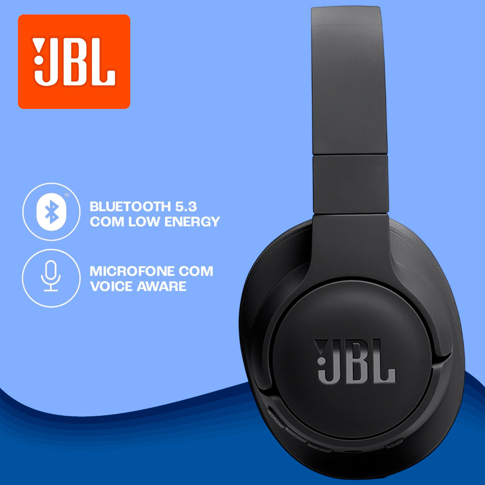 Headphone JBL Tune 720BT BLK – Headphone Bluetooth Over-Ear Preto – 76 h de Bateria – JBL Pure Bass Descrição Comercial O Headphone JBL Tune 720BT BLK oferece uma experiência de áudio envolvente com o icônico som JBL Pure Bass, ideal para quem quer ouvir músicas, podcasts e assistir vídeos com qualidade e liberdade sem fio. Com Bluetooth 5.3, ele proporciona conexão estável e rápida com seus dispositivos compatíveis. Tem autonomia de até 76 horas de reprodução, com suporte a carregamento rápido — 5 min de carga garantem horas de música extra — e controles integrados no próprio fone para ajustar volume, atender chamadas e gerenciar playlists com praticidade. Leve, dobrável e confortável, é perfeito para uso no dia a dia, viagens ou momentos de lazer. Características - Som JBL Pure Bass potente e equilibrado. - Tecnologia sem fio Bluetooth 5.3 para conexão estável. - Autonomia de até 76 h de bateria com reprodução contínua. - Carregamento rápido: 5 min = até 3 h de música. - Controle de volume, músicas e chamadas diretamente no fone. - Microfone integrado para chamadas viva-voz. - Design dobrável para transporte e armazenamento. - Compatível com o aplicativo JBL Headphones para ajustes de equalização (EQ). - Conectividade multiponto (conexão com dois dispositivos). Benefícios: - Mais liberdade para curtir música sem fios. - Longa duração de bateria, ideal para viagens e uso prolongado. - Carregamento rápido para menos tempo conectado à tomada. - Controle prático no próprio fone, sem precisar acessar o celular. - Dobrável e portátil, fácil de guardar e levar. - Chamadas mais confortáveis com microfone integrado. Orientações de Uso - Antes do primeiro uso, carregue totalmente a bateria. - Emparelhe com o Bluetooth do seu smartphone, tablet ou computador. - Ajuste o volume confortavelmente para evitar desconforto auditivo. - Use o controle no fone para gerenciar músicas e chamadas. - Guarde o headphone dobrado em local seco quando não estiver usando. - Limpe suavemente as almofadas com pano seco, evitando líquidos. Ficha Técnica - Marca: JBL - Modelo: Tune 720BT - EAN: 6925281967061 - Cor: Preto - Tipo de produto: Headphone Bluetooth Over-Ear - Tecnologia de som: JBL Pure Bass - Versão Bluetooth: 5.3 - Perfis Bluetooth: A2DP, AVRCP, HFP - Autonomia de bateria: Até 76 h - Carregamento rápido: Sim (5 min ≈ 3 h extras) - Tempo de carga total: ~2 h - Drivers: 40 mm - Resposta de frequência: 20 Hz – 20 kHz - Impedância: 32 ohms - Sensibilidade: 101 dB SPL @ 1 kHz - Microfone: Integrado - Conectividade multiponto: Sim - Dobrável: Sim - Frequência de operação Bluetooth: 2,4 GHz - Peso aproximado: 220 g Conteúdo da Embalagem - 01 Headphone JBL Tune 720BT - 01 Cabo de carregamento USB-C - 01 Cabo de áudio removível (P2) - 01 Guia de início rápido