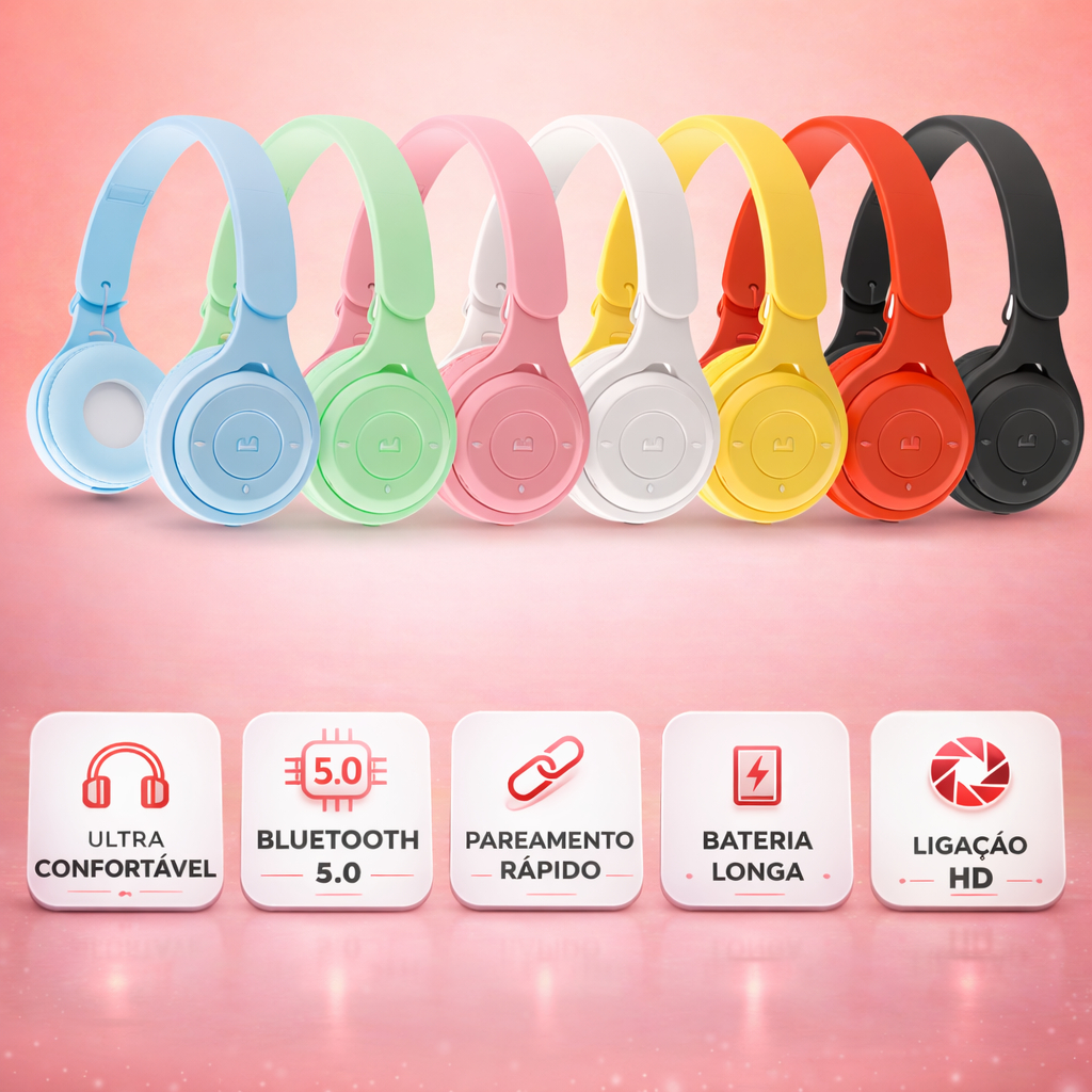 FONE OUVIDO BLUETOOTH SEM FIO AJUSTE TAMANHO ENTRADA P2 CARTÃO MEMÓRIA RÁDIO FM COLORIDO