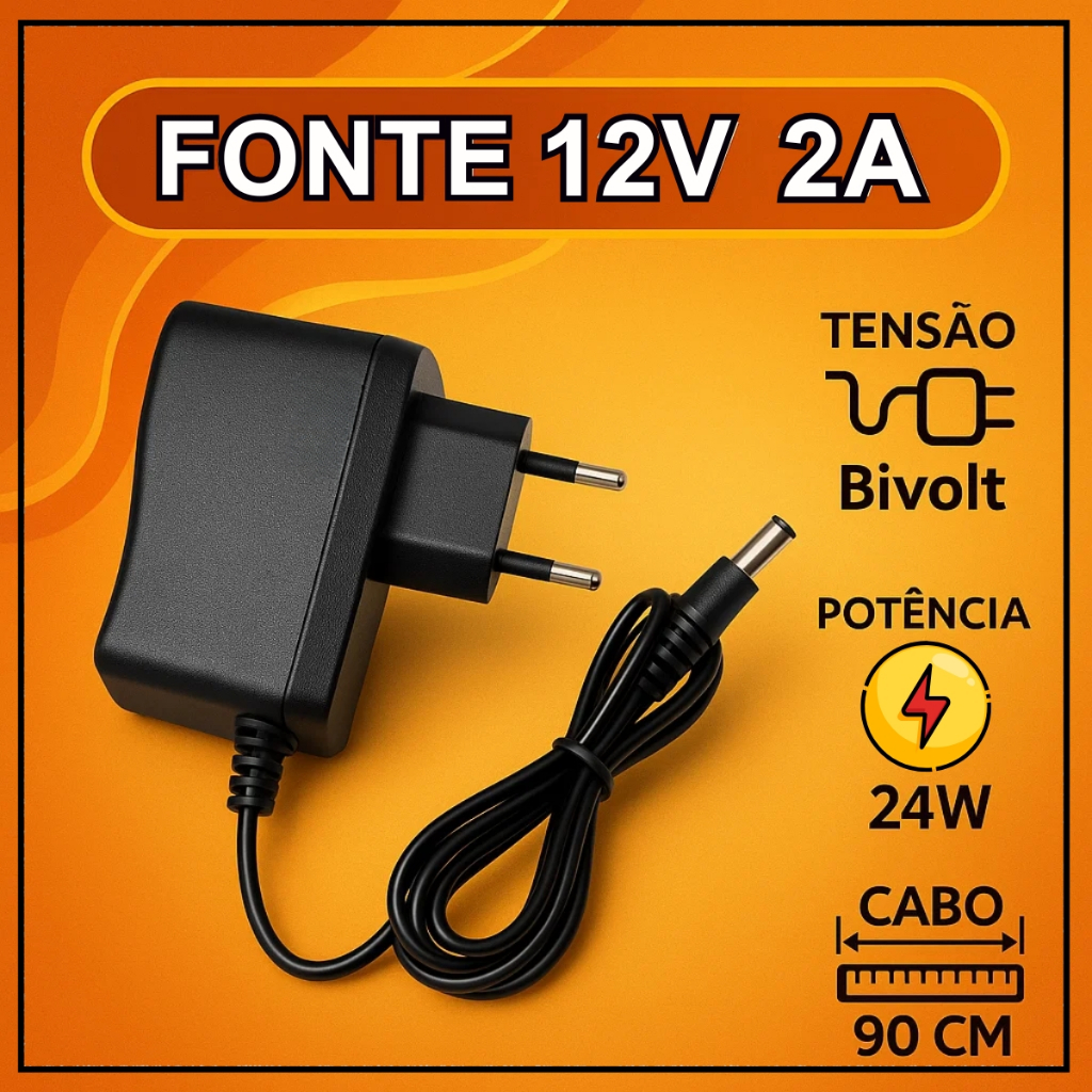 Fonte Alimentação 12V 2A 3A 5A 10A Bivolt Conector P4 Pode ser usada em qualquer sistema para alimentar: Fitas Led, CFTV, Câmeras segurança, Repetidores, etc. Especificações; - Voltagem de entrada: 110/220V Bivolt automática; - Voltagem de saída: 12V; - Amperagem: 2A; 3A; 5A e 10A. - Conector(diâmetro): Plug P4 macho 2,1mm x 5,5mm; - Polaridade de saída: positivo interno / negativo externo; - Frequência: 50/60Hz; - Potência Máxima: 2A - 24W 3A - 36W 5A - 60W 10A - 120W - Peso 2A - 60,7g 3A - 69,0g 5A - 85,5g 10A - 126,5g - Proteção Contra Curto Circuito e Sobre Carga; - Comprimento total do cabo da fonte de 2A: 90 cm - Comprimento total do cabo da fonte de 3A: 90 cm - Comprimento total do cabo da fonte de 5A: 90 cm - Comprimento total do cabo da fonte de 10A: 90 cm * Veja se o produto que você esta comprando é compatível com potência necessária para o seu equipamento, para que não haja mau funcionamento do mesmo. * Qualquer dúvida, entre em contato conosco.
