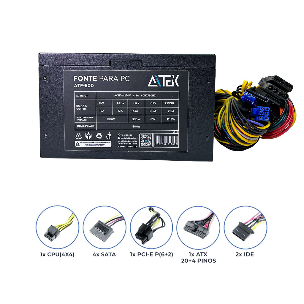 Fonte ATX para PC Aitek ATF-500 500W - Energia Confiável para seu Computador! A Fonte ATX Aitek ATF-500 é uma solução de energia eficiente e compacta, ideal para computadores de baixo consumo. Com 500W de potência, ela é perfeita para sistemas básicos, como PCs de escritório, para estudos ou para uso diário, garantindo a estabilidade necessária para os seus componentes. Ideia de Uso Ideal para a montagem de PCs de entrada ou para a substituição de uma fonte antiga em um sistema que não requer uma placa de vídeo dedicada. É a escolha certa para quem busca uma fonte confiável e com bom custo-benefício para tarefas simples como navegação na internet, edição de documentos e aulas online. Atenção Antes de Instalar A fonte possui uma entrada bivolt chaveada. Antes de conectar o cabo de energia e ligar, verifique se a chave seletora de voltagem está na posição correta (110V ou 220V) para a sua rede elétrica. Isso é crucial para evitar danos à fonte e aos componentes do seu PC. Itens Inclusos 1x Fonte de Alimentação ATX 500W Aitek ATF-500 1x Cabo de Força Características do Produto Potência: 500W. Ventilador: 12cm Conectores: Placa-Mãe: 1x conector de 20+4 pinos, compatível com a maioria das placas-mãe. CPU: 1x conector de (4+4 pinos) para o processador. PCI-e: 1 x conector 6+2 pinos SATA: 4x conectores para SSDs e HDs SATA. Molex: 2x conectores para periféricos e drives mais antigos. Compatibilidade: O formato ATX padrão (150mm x 140mm x 86mm) é compatível com a maioria dos gabinetes de PC. Com a Fonte ATX Aitek ATF-500, você terá uma base de energia sólida para as suas necessidades de computação básicas.
