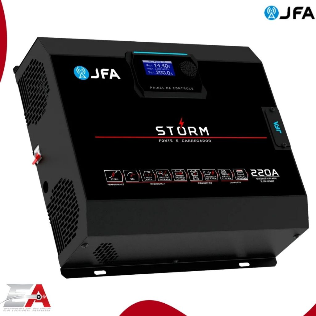 FONTE STORM 220A (BIVOLT) – JFA A Storm 220A redefine o padrão das fontes automotivas, unindo potência, controle e inteligência. Com design moderno e display intuitivo, é fácil de operar e oferece uma experiência prática ao usuário. Possui 10 modos inteligentes, incluindo opções para geradores, baterias de lítio, carga lenta, equalização e teste de CCA. A navegação pelas funções é simples: basta girar o botão e acompanhar tudo pelo display iluminado. Robusta e tecnológica, garante estabilidade, proteção avançada e compatibilidade com diversos tipos de bateria. DIFERENCIAIS DA FONTE E CARREGADOR STORM: - Alta compatibilidade: Funciona com baterias de lítio, geradores e diferentes aplicações. - Display completo: Visual interativo com todas as funções e parâmetros em tempo real. - 10 modos inteligentes: Inclui SCI, carga lenta, lithium, teste de CCA e mais. - Tensão ajustável: De 12,5V a 14,5V, com função STORM que chega a 15V por 30s. - Carga eficiente: SCI automático e carga lenta em três fases para maior vida útil da bateria. - Ventilação inteligente: Sistema PWM que reduz ruído e melhora a refrigeração. - Proteções completas: Contra subtensão, sobretensão, sobrecorrente e superaquecimento. - Design robusto: Moderno, resistente e feito para uso intenso no som automotivo. A Storm 220A é sinônimo de tecnologia de ponta, alto desempenho e confiabilidade para quem leva som automotivo a sério. ESPECIFICAÇÕES TÉCNICAS: - Função Storm: máxima performance - CCA: diagnóstico da bateria - Entrada AC: 90 a 140Vac / 170 a 240Vac (Bivolt automático) - Consumo com máxima carga: 3350W - Corrente máxima de saída: 220A - Medidor de tensão de entrada: Vac-TRUE RMS - Display: Display gráfico 128 x 64px (exibe tensão, corrente, potência e tensão AC simultâneos) - Tensão de Saída Ajustável: 10,0Vdc a 16,0Vdc (ajustável com passos de 0,1Vdc digital) - SCI - Sistema de Carga Inteligente: 13,8Vdc a 14,4Vdc cíclico - Sistema de carga lenta: 4 fases (teste, elevação, absorção, flutuação) - Sistema de equalização automática: 4 fases (teste, elevação, equalização, flutuação) com ajuste de tempo - Sistema para baterias lithium/solar: Configurável de 10,0Vdc a 16,0Vdc com ajuste de corrente máxima e tempo de carga - Seleção de entrada: Rede AC ou Modo Gerador (selecionável) - Smart Cooler: Sistema de ventilação inteligente com controle PWM - Precisão do voltímetro/amperímetro: 99% / 96% - Proteções: Excesso de carga, curto-circuito na saída e superaquecimento - Dimensões: 110 mm x 320 mm x 290 mm (L x A x P) - Peso: 4,1 kg CONTEÚDO DA EMBALAGEM: - 1 Fonte JFA Storm 220A - Manual digital (acesso via QR Code ou site do fabricante) ATENÇÃO: - Garantia de 12 meses; - Recomendamos que a instalação seja feita por profissional especializado; - Imagens meramente ilustrativas.