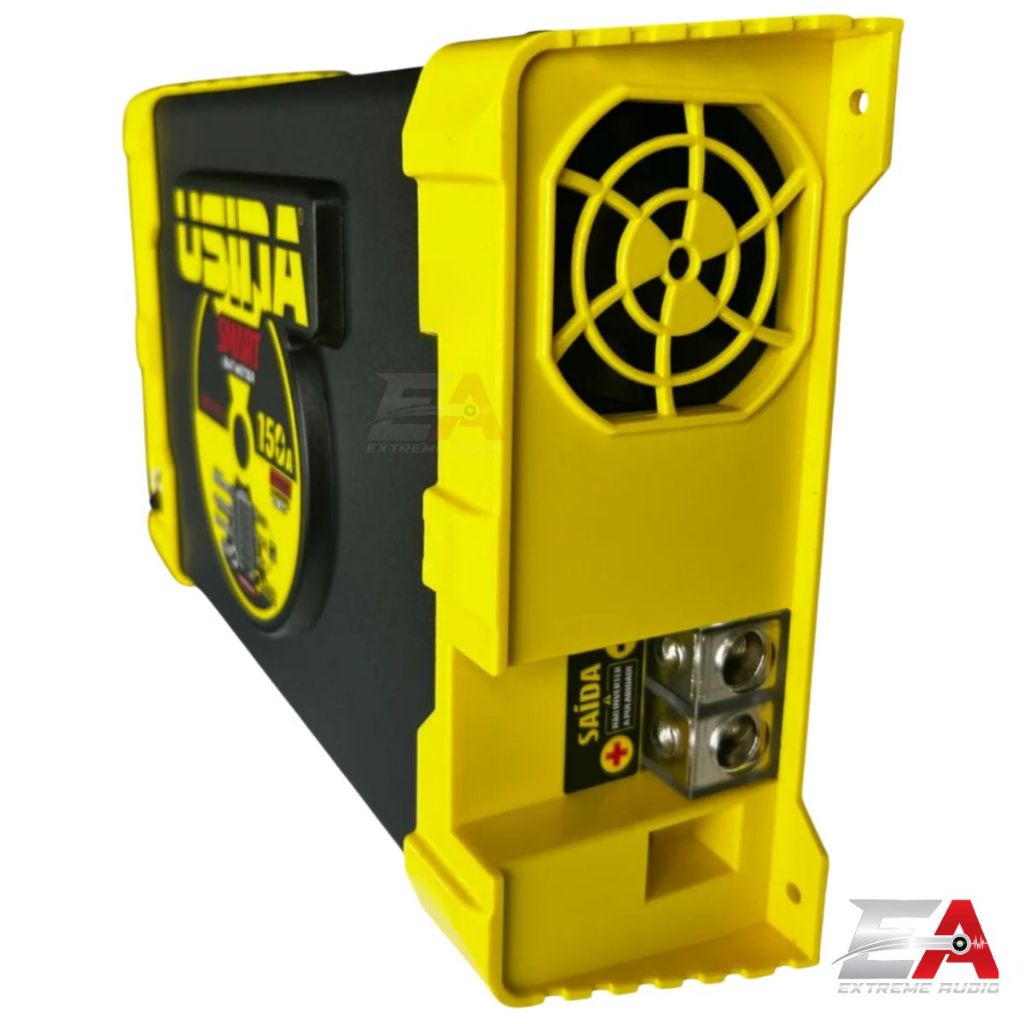 Fonte e Carregador Bat Meter 150A - 12V A fonte USINA foi criada com o principal objetivo de alimentar o sistema de som do carro sem deixar suas baterias descarregarem, mesmo com o som tocando por várias horas. Pode ser utilizada também como fonte e alimentação direta (sem uso de baterias), alimentando toca-cd, módulos de potência, etc. Especificações Tensão de Entrada: Bivolt Automático AC 127Vca: 100 @ 140Vca AC 220Vca: 170 @ 250Vca Consumo 127Vca: 33A (máximo) Consumo 220Vca: 17A (máximo) Tensão de Saída: 12V @ 14,4Vcc (+-1%) Corrente de Saída: 150A @ 12,5Vcc (+-5%)* Potência de Saída: 2000 Watts (máxima)** Rendimento: 85% Potência de entrada (V.A): 3000V.A Potência de Entrada: 2400 Watts (máxima)** Cabo de Entrada: 3x2,5mm² - 2P+T Proteção de Entrada: Disjuntor 32A Cabo de Saída: 35mm² Extensão Recomendada: 4mm² (máx 30 metros) Peso:2,900 Kg Dimensões Aproximadas (CxLxA): 313mmX195mmX76mm*** Observações: *Corrente e potência aferidos em carga resistiva **A potência de saída pode variar de acordo com a tensão da bateria e condições de uso