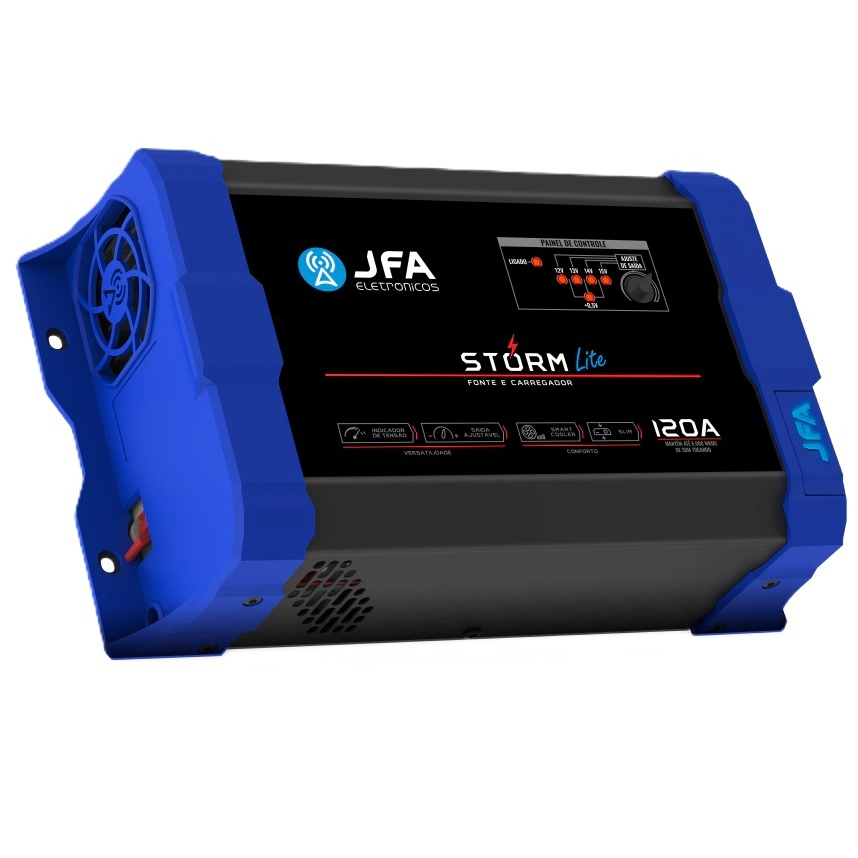 A Fonte e Carregador Storm Lite JFA é a melhor opção para alimentação do seu sistema de som, utilizando ou não baterias, com ótimo custo benefício. Seu diferencial é possuir a voltagem de até 15.2V, com a tensão para equalização dos vasos internos da bateria, única do mercado. Diferenciais da Fonte e Carregador Storm Lite: • Saída ajustável, 12V até 15,2V – tensão para equalização dos vasos internos da bateria; • Indicador de tensão, com voltagem de até 15.2V; • Smart cooler – sistema de ventilação inteligente; • Slim – design arrojado e compacto; Especificações Técnicas • Entrada: 90 a 140Vac / 170 a 240Vac (Bivolt Automático) • Consumo com máxima carga: 1800W • Corrente máxima de saída carga: 120 Amperes • Tensão de saída ajustável: 12 a 15.2Vac • Smart Cooler: Controle dinâmico por PWM • Proteções: Excesso de carga / Curto na saída / Temperatura • Dimensões L x A x P (cm): 28 x 16,3 x 9 • Peso kg: 1,440 • Potência máxima com bateria: 6.000W rms • Potência máxima sem bateria: 1500W rms