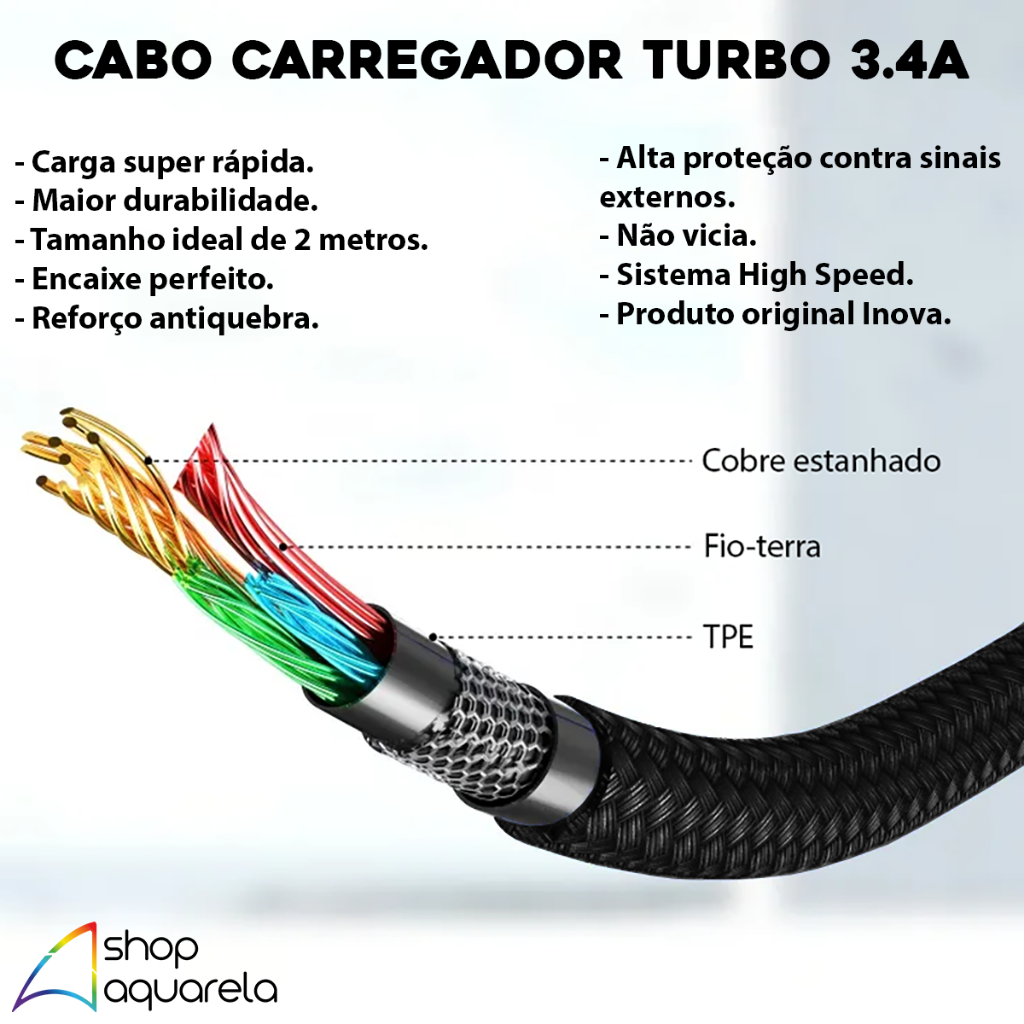 Fonte Carregador Turbo 3 Portas USB + 1 Cabo (Lightning, V8, Tipo C) - Carga ultra rápida; - Carrega até 3 aparelhos ao mesmo tempo; - Nao vicia ou danifica o celular; - Maior durabilidade; - Cabos de 2 metros de comprimento; - Revestimento de nylon; - Encaixe perfeito; - Reforço antiquebra; COMPATIBILIDADE DA FONTE - Compatível com todos os celulares e funciona com todos os cabos. - MP3, MP4, GPS, caixas de som, microfones, câmeras, ring lights, smartwatchs, controles, fones de ouvido, portáteis, tablets, dentre outros aparelhos com carregamento USB. COMPATIBILIDADE DO CABO LIGHTNING - Todos os modelos de iPhone do 5 ao 14, iPads e iPod. COMPATIBILIDADE DO CABO USB-C TIPO C - Modelos novos de celulares Android e fones de ouvido, e iPhones à partir do 15. COMPATIBILIDADE DO CABO MICRO USB-V8 - Modelos de celulares mais antigos, caixas de som, fones de ouvidos, joysticks, controles, MP4, GPS, entre outros aparelhos com carregamento por USB. INFORMAÇÕES TÉCNICAS - Marca: Inova - Saídas da Fonte: 3 portas USB - Voltagem da Fonte: AC 100-240V (50-60Hz) - Ampegarem da Fonte: DC 5V – 5.1A (25.5W Total) - Amperagem do Cabo: 3.4A - Comprimento do Cabo: 2 Metros - Acabamento do Cabo: Revestimento em Nylon ITENS INCLUSOS - 1 Fonte turbo com 3 USB - 1 Cabo carregador 2 metros Lightning, Micro-USB V8 ou Tipo C