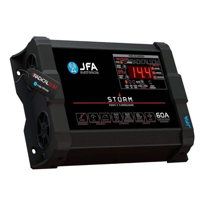 Fonte Automotiva JFA STORM 60A 900W Bivolt Voltímetro + Amperímetro + medidor de CCA (única fonte com esta tecnologia do Brasil)! A Storm é mais que uma fonte. Ela é a revolução de tudo o que a JFA já produziu. Equipada com a mais alta tecnologia, compacta e com funções exclusivas, a Storm é a melhor escolha para carregar, alimentar e também monitorar o funcionamento de baterias automotivas. Ela reúne as principais características das linhas SCI e Redline e inaugura um novo conceito de Fonte Inteligente. Diferenciais da Storm: - Função Storm que eleva, por curto tempo, a tensão de saída para 15V, dando a máxima performance ao amplificador; - Sistema de Carga Inteligente (SCI) e Sistema de Carga lenta em três fases; - Exclusiva função de diagnóstico da bateria, em apenas 10 segundos, através do medidor de CCA e análise real da capacidade de acúmulo de carga; - Sistema de ventilação inteligente com controle dinâmico por PWM; - Design compacto, menor que as linhas anteriores, e harmônico, ideal para qualquer projeto. Especificação Técnica: • Consumo com Máxima Carga: 900W • Mantém Até 3.000WRMS de som tocando • Bivolt Automático: 110/220Vac • Entrada de Rede Elétrica Bivolt: 90 a 140Vac/ 170 a 240Vac • Tensão de Saída Selecionável: 12,6V / 13,0V / 13,4V / 13,8V / 14,0V / 14,4V • Sistema de carga inteligente: 13,8 / 14,4 cíclico • Corrente de Saída: 60 Amperes • Função SCI: Sistema de Carga Inteligente • Precisão do Voltímetro / amperímetro: 99% / 96% • Display para Monitorar Tensão ou Corrente • Sistema de Carga Lenta (3 fases): Elevação /Absorção/ Equalização • LEDs Indicadores de Nível da Bateria e Carga Completa • Proteções: Excesso de Carga, Curto na Saída e Temperatura • Smart Cooler - Sistema de Ventilação Inteligente • Controle: Dinâmico por PWM • Topologia: Half Bridge • Peso: 1,440 Kg • Medidas Aproximadas (LxAxP): 25,9x15,1x5,8cm Conteúdo da Embalagem: • 01 Fonte Automotiva JFA 60a Storm • Manual de Instruções • Nota fiscal