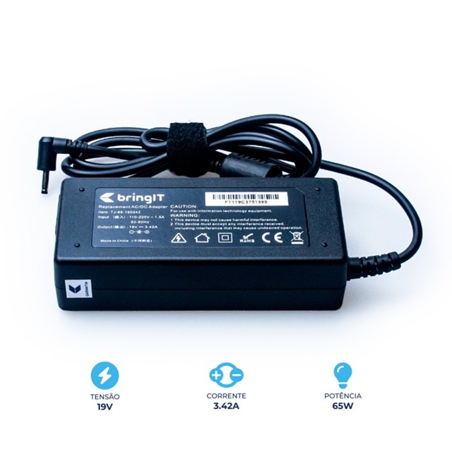 Fonte Carregador para Notebook Acer Aspire 5113WLMI | 19 V 3.42 A 65 W | 19 V 3.42 A 65 W A fonte para Acer Aspire 5113WLMI foi aprovada em rigorosos testes de qualidade e atende todas as exigências do seu equipamento. Possui tecnologia exclusiva de proteção contra excessos de corrente, superaquecimento e curto-circuito. Todas as fontes bringIT possuem 36 meses de garantia contra defeitos de fabricação. E contam com seletor automático de tensão, que permite funcionamento em 110V e 220V. OUTPUT: DC 19 V 3.42 A 65 W Plug: 3.0 mm x 1.1 mm Caso você não possua a fonte original, você pode encontrar esta informação em seu notebook indicada como INPUT. Itens inclusos: cabo de 1,20 m Marca: bringIT Modelo: 5113WLMI Referência: FT119-AC-0341 Atenção: Para que essa fonte seja compatível com seu notebook, deverá ter pino e voltagem iguais e a amperagem igual ou maior que a do anúncio. Esse produto é compatível com os notebooks: NP530U3C-A01US, 15U340-L.BK36P1, NP900X4D, S7-392-9439, 14Z950-G.BK71P1, 15U340-L.BJ36P1, NP530 NP535 NP540, NP940X3G-K03US, NP530U3C-A05US Ficou na dúvida da compatibilidade ou precisa de mais informações? Deixe sua pergunta que nosso time técnico especializado está preparado para auxiliar! A bringIT é líder de mercado com o maior mix de produtos e peças para notebook: Baterias, telas, teclados e carregadores compatíveis com notebooks Dell, Lenovo, Acer, HP, Asus e muito mais!