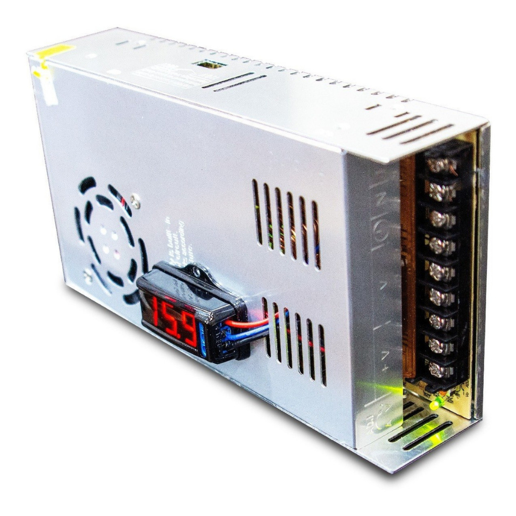 Itens inclusos: 1 - Fonte Chaveada 50A 12v 1 - Voltímetro Digital Taramps VTR 1000 + Cabo de ligação Fonte Chaveada 50A 12v Informações técnicas: - Produto: Fonte chaveada - Potência: 360w - Entrada: AC 110-220v - Frequência: AC50/60Hz - Saída: DC 12v 50A - Chaveamento de ajuste de tensão (127-220v) (MANUAL) - Conexão por borne - Número de transistor: 1 - Possui cooler - Material: Alumínio e Metal - Dimensões: 21,5 x 11,5 x 5 cm - Peso: 0,459 Kg Voltímetro Digital Taramps VTR 1000 Especificação Técnica: • Quando a tensão chegar a 10,2V, considerada baixa, ele pisca. • Display de 3 dígitos com atualização em tempo real. • Faixa de Medição: 5V a 30V • Precisão (típica): +/- 0,1V • Consumo: 48mA @ 12,6V • Dimensões (LxAxP): 67,5 x 16,5 x 52,5 mm • Peso: 0,1 Kg