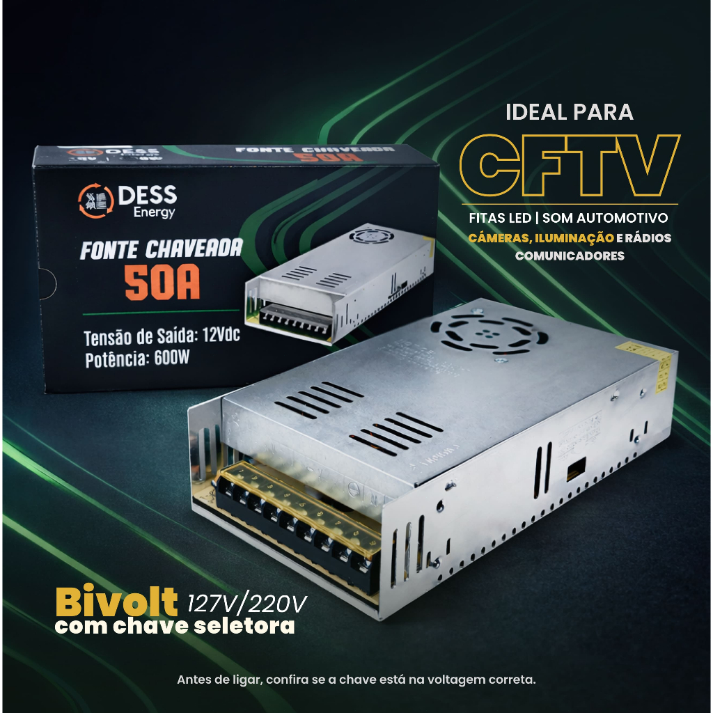 Fonte Chaveada Dess Energy 12V 50A 600W Bivolt Conversor Elétrico