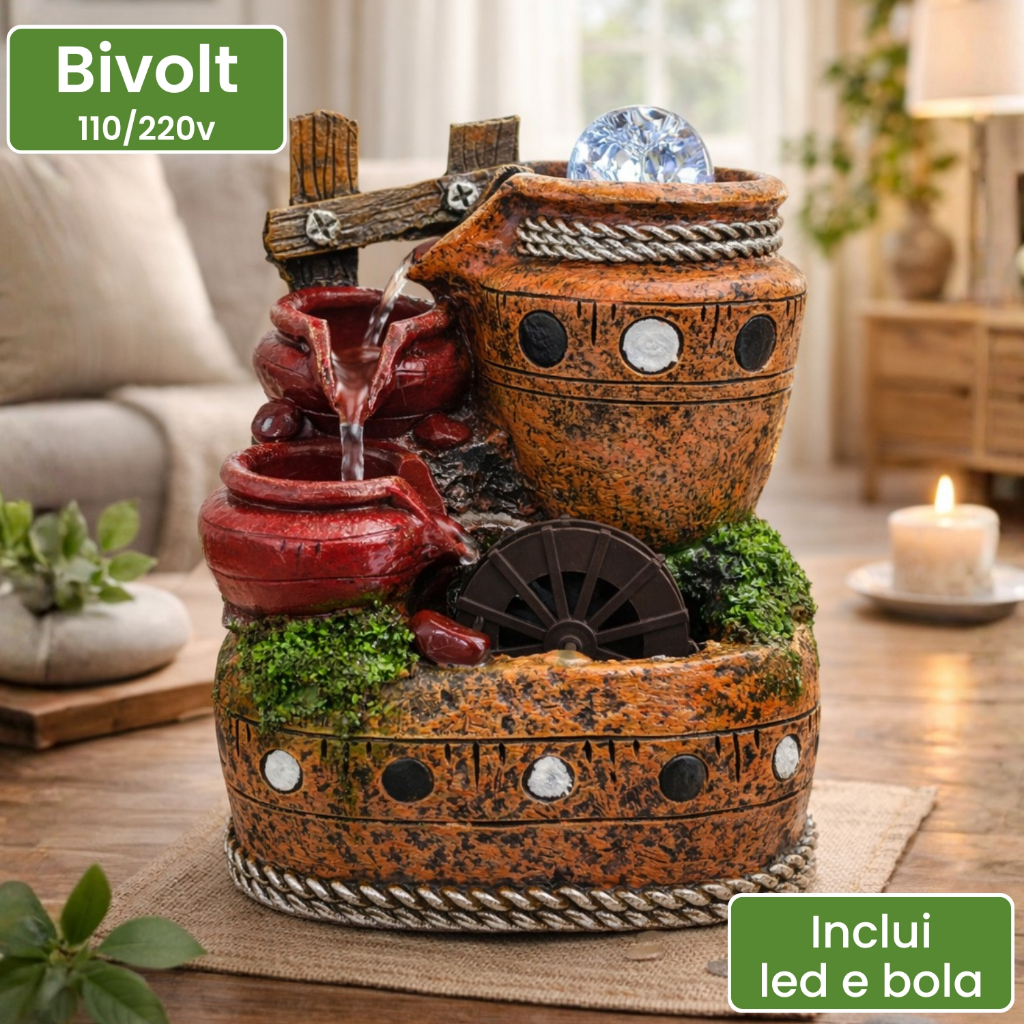 Fonte de Água Cascata Anfora Decorativa em Resina 3 Quedas Bola Roda Giratoria Bivolt