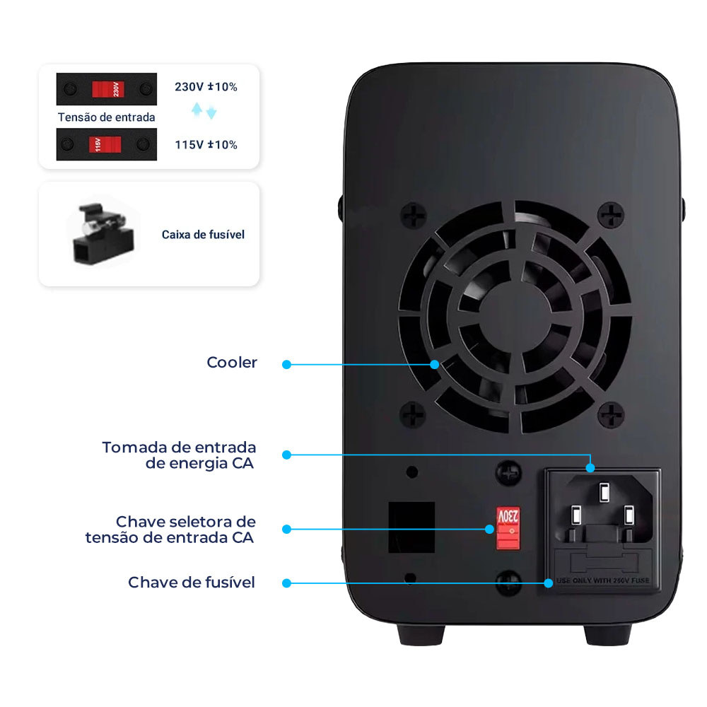 < Fonte de Bancada Wanptek APS605H 60V 5A 300W 4 Dígitos com Display LED e Saída USB Fonte ajustável para bancada profissional APS605H é ideal para quem precisa de precisão e segurança em projetos eletrônicos, testes, reparos e desenvolvimento. Com tensão ajustável de 0 a 60V e corrente de até 5A , ela garante potência e estabilidade para diversas aplicações. Principais características: Tensão ajustável: 60V Corrente ajustável: 5A Potência total: 300W Dimensões: 19 cm x 9 cm x 14.5 cm Garantia: 12 meses contra defeitos de fabricação Diferencias da APS605H : Saída auxiliar USB para alimentação de pequenos dispositivos Display digital de alta definição (4 dígitos) Proteção contra curto-circuito, sobrecarga e superaquecimento Alta estabilidade e baixo ruído ripple (ideal para circuitos sensíveis) Bivolt automático (110V/220V) Ideal como: Testes de motores DC Automação Manutenção e reparo de equipamentos Manutenção industrial Projetos com corrente mais alta Referência: FB014