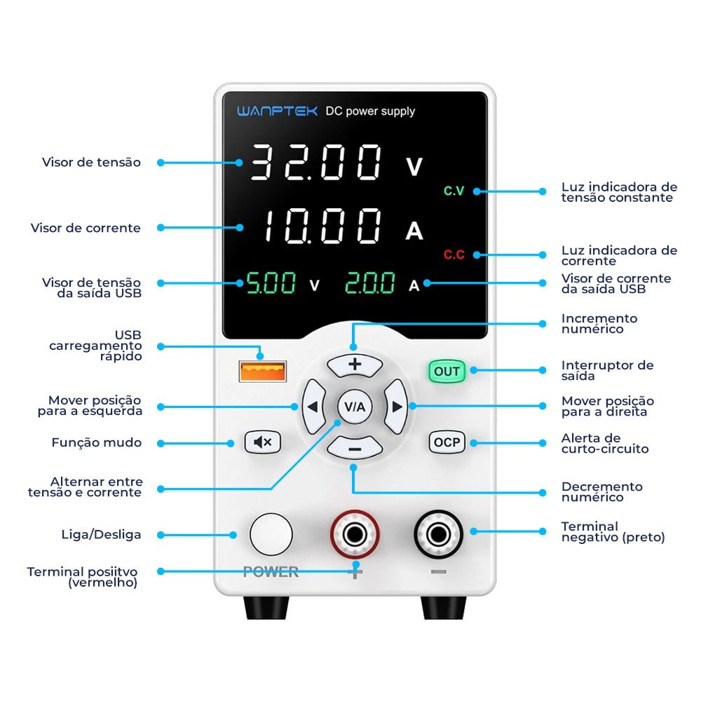Fonte de Alimentação de Bancada Wanptek GC3010 32V 10A 320W 4 Dígitos Branco com Display LED Fonte ajustável para bancada profissional GC3010 é ideal para quem precisa de precisão e segurança em projetos eletrônicos, testes, reparos e desenvolvimento. Com tensão ajustável de 0 a 32V e corrente de até 10A , ela garante potência e estabilidade para diversas aplicações. Principais características: Tensão ajustável: 32V Corrente ajustável: 10A Potência total: 320W Dimensões: 19 cm x 8 cm x 14.5 cm Garantia: 12 meses contra defeitos de fabricação Diferencias da GC3010 : Saída auxiliar USB para alimentação de pequenos dispositivos Display digital de alta definição (4 dígitos) Proteção contra curto-circuito, sobrecarga e superaquecimento Alta estabilidade e baixo ruído ripple (ideal para circuitos sensíveis) Bivolt automático (110V/220V) Ideal como: Bancadas didáticas pequenos laboratórios Manutenção e reparo de equipamentos testes com LEDs e motores Referência: FB032