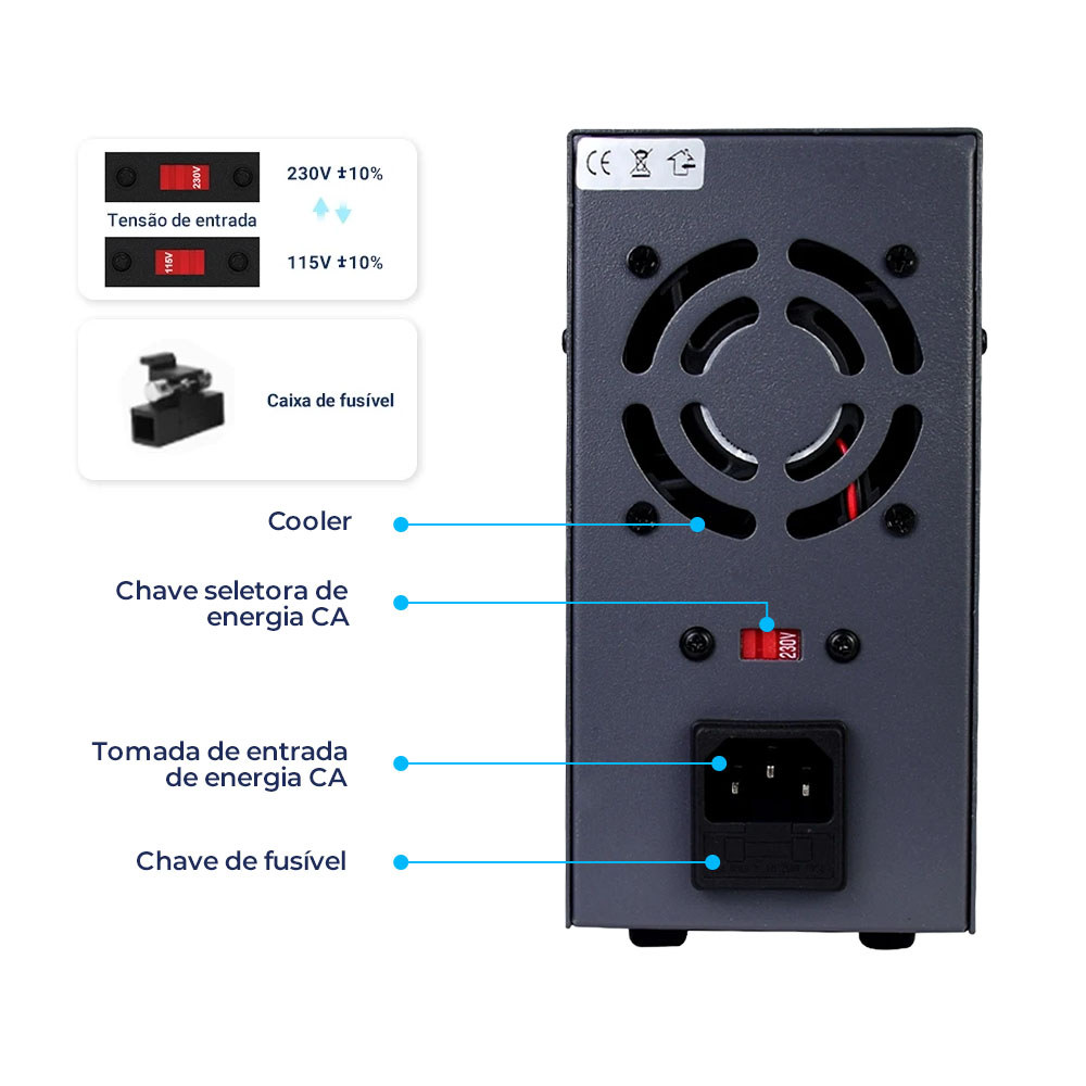 Fonte de Bancada Wanptek KPS605DF 60V 5A 300W 3 Dígitos com Display LED Fonte ajustável para bancada profissional KPS605DF é ideal para quem precisa de precisão e segurança em projetos eletrônicos, testes, reparos e desenvolvimento. Com tensão ajustável de 0 a 60V e corrente de até 5A , ela garante potência e estabilidade para diversas aplicações. Principais características: Tensão ajustável: 60V Corrente ajustável: 5A Potência total: 300W Dimensões: 27.5 cm x 20 cm x 10.5 cm Garantia: 12 meses contra defeitos de fabricação Diferencias da KPS605DF : Saída auxiliar USB para alimentação de pequenos dispositivos Display digital de alta definição (4 dígitos) Proteção contra curto-circuito, sobrecarga e superaquecimento Alta estabilidade e baixo ruído ripple (ideal para circuitos sensíveis) Bivolt automático (110V/220V) Ideal como: Robótica manutenção de equipamentos industriais Manutenção e reparo de equipamentos motores DC Referência: FB017