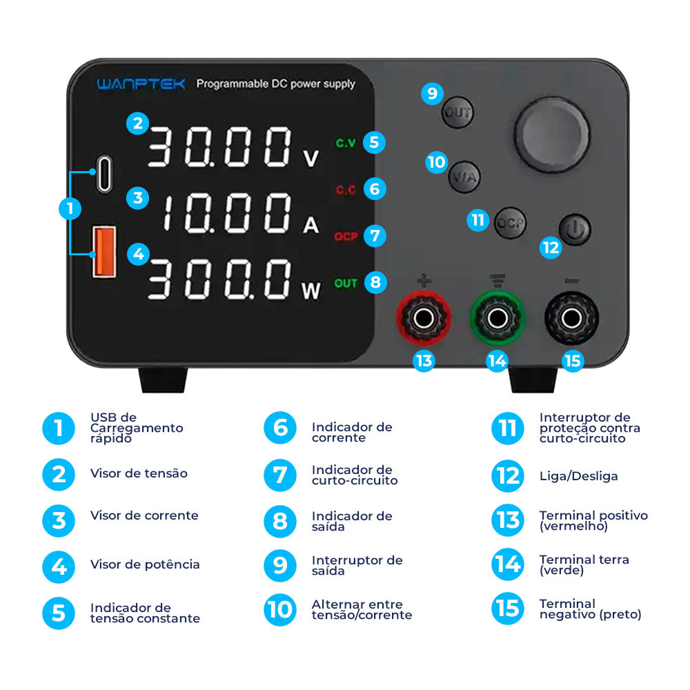 Fonte de Bancada Digital Wanptek TPS3010 30V 10A 300W Fonte ajustável para bancada profissional Wanptek TPS3010 é ideal para quem precisa de precisão e segurança em projetos eletrônicos, testes, reparos e desenvolvimento. Com tensão ajustável de 0 a 30V e corrente de até 10A, ela garante potência e estabilidade para diversas aplicações. Principais características: Tensão ajustável: 30V Corrente ajustável: 10A Potência total: 300W Dimensões: 19 cm x 9 cm x 14.5 cm Garantia: 12 meses contra defeitos de fabricação Diferencias da TPS3010: Saída auxiliar USB para alimentação de pequenos dispositivos Display digital de alta definição (4 dígitos) Proteção contra curto-circuito, sobrecarga e superaquecimento Alta estabilidade e baixo ruído ripple (ideal para circuitos sensíveis) Bivolt automático (110V/220V) Ideal como: Uso geral em eletrônica Projetos com consumo médio de corrente Manutenção e reparo de equipamentos Carregamento de baterias Referência: FB003