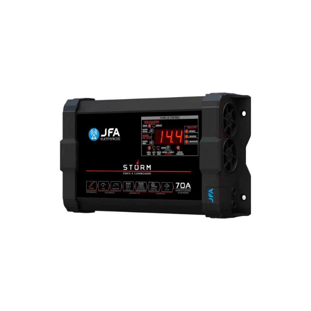 Fonte e Carregador de Bateria JFA Storm Plus 60A / 70A / 120A / 200A Bivolt A linha Storm Plus da JFA representa o que há de mais moderno em fontes e carregadores automotivos. Compacta, eficiente e com recursos exclusivos, ela foi desenvolvida para entregar desempenho máximo com segurança e confiabilidade. Ideal para sistemas de som automotivo e aplicações profissionais. Modelos disponíveis: ● Storm Plus 60A ● Storm Plus 70A ● Storm Plus 120A ● Storm Plus 200A Escolha a amperagem adequada ao seu projeto. Principais características (comuns a todos os modelos): ● Função Storm: eleva temporariamente a tensão de saída para 15V, proporcionando o máximo desempenho aos amplificadores. ● Sistema de Carga Inteligente (SCI): modo cíclico entre 13,8V e 14,4V para carregamento otimizado. ● Diagnóstico rápido da bateria: mede o CCA e avalia a capacidade de acúmulo de carga em apenas 10 segundos. ● Smart Cooler: ventilação inteligente com controle dinâmico por PWM. ● Design compacto e robusto: ideal para qualquer tipo de instalação. Especificações do modelo Storm Plus 200A (modelo de maior capacidade da linha): ● Entrada AC: 90 a 140V / 170 a 240V (bivolt automático) ● Consumo com carga máxima: 3000W ● Corrente máxima de saída: 200A ● Tensão de saída ajustável: 12,6V / 13,0V / 13,4V / 13,8V / 14,0V / 14,4V ● Sistema de carga lenta em 3 fases: Elevação / Absorção / Equalização (personalizável) ● Precisão do voltímetro: 99% / amperímetro: 96% ● Proteções: contra excesso de carga, curto-circuito na saída e superaquecimento ● Dimensões (L x A x P): 317 x 172 x 95 mm ● Peso: 2,650 kg As especificações podem variar conforme o modelo escolhido. Conteúdo da embalagem: ● 01 Fonte e Carregador de Bateria JFA Storm Plus (modelo escolhido) ● 01 Manual do usuário