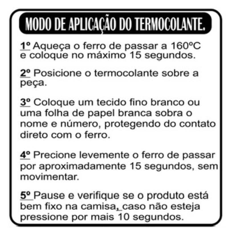 >>>>>>>> LEIA ATENTAMENTE <<<<<<< • Após a compra informar no chat qual nome e numeração deseja. • Nome + número para personalizar seu manto! • Termocolante para estampar em casa na camisa. • Você pode personalizar em algodão, poliester, jeans, etc. • MEDIDAS - letra - 4,5 cm - número - 25cm • Somente o termocolante para você personalizar em casa ! • NÃO ACOMPANHA A CAMISA! >>>>>> Faça você mesmo com o ferro de passar roupa ⬇️ 1º aqueça o ferro de passar a 160°C, coloque no máximo 15 segundos 2º posicione o adesivo sobre a peça 3º coloque um tecido fino branco ou uma folha de papel branca sobre o nome e número, protegendo do contato direto com o ferro de passar 4º pressione levemente o ferro de passar por aproximadamente 15 segundos; sem movimentar 5º pause e verifique se o produto está bem fixo na camisa, caso não esteja pressione por mais 10 segundos Material em DTF, melhor material do mercado ! ENVIAMOS UM PLÁSTICO ANTI CALOR PARA NÃO PREJUDICAR SUA CAMISA! Aguardamos sua compra, qualquer dúvidas estamos a disposição no chat