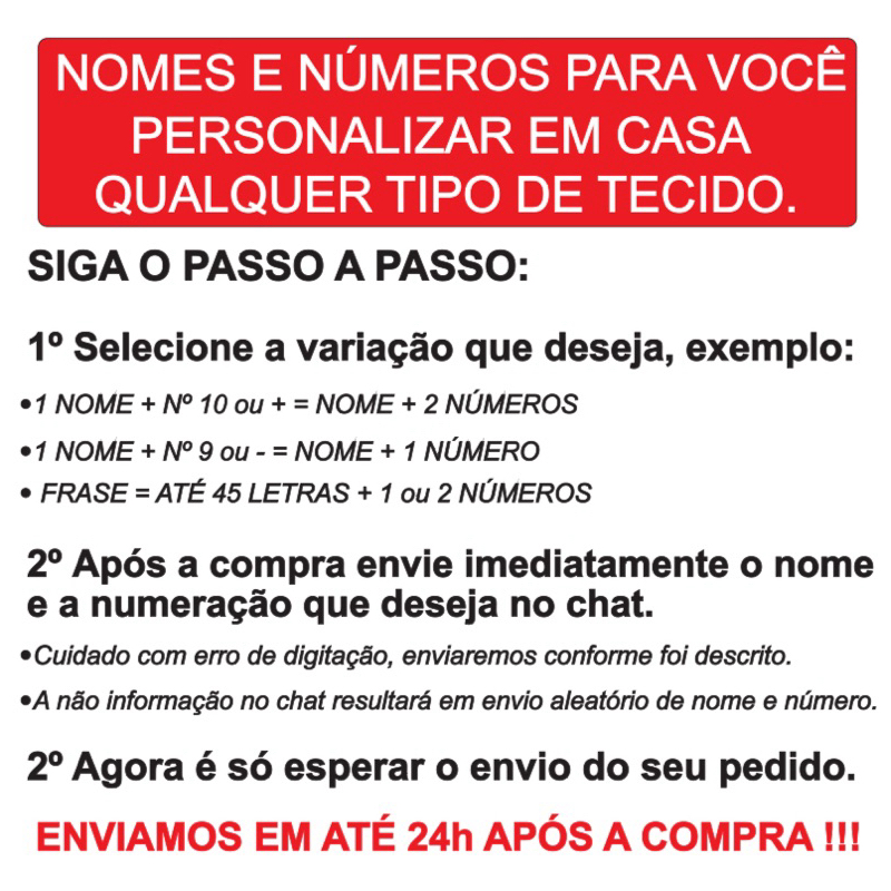 >>>>>>>> LEIA ATENTAMENTE <<<<<<< #### INFORME NO CHAT A FONTE QUE DESEJA ##### • Time? • cor? • ano? • Masculino, feminino ou infantil? *****FONTES ANTERIOR A 2024 CONFIRMAR NO CHAT SE TEM DISPONIBILIDADE ***** • Após a compra informar no chat qual nome e numeração deseja. • Nome + número para personalizar seu manto! • Termocolante para estampar em casa na camisa. • Você pode personalizar em algodão, poliester, jeans, etc. • MEDIDAS - letra - 4,5 cm - número - 25cm • Somente o termocolante para você personalizar em casa ! • NÃO ACOMPANHA A CAMISA! >>>>>> Faça você mesmo com o ferro de passar roupa ⬇️ 1º aqueça o ferro de passar a 160°C, coloque no máximo 15 segundos 2º posicione o adesivo sobre a peça 3º coloque um tecido fino branco ou uma folha de papel branca sobre o nome e número, protegendo do contato direto com o ferro de passar 4º pressione levemente o ferro de passar por aproximadamente 15 segundos; sem movimentar 5º pause e verifique se o produto está bem fixo na camisa, caso não esteja pressione por mais 10 segundos Material em DTF, melhor material do mercado ! ENVIAMOS UM PLÁSTICO ANTI CALOR PARA NÃO PREJUDICAR SUA CAMISA! Aguardamos sua compra, qualquer dúvidas estamos a disposição no chat
