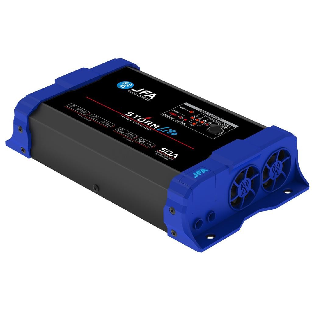 ##Carroussel Apresenta## As Fontes e Carregadores JFA são referência em potência e tecnologia para carregar baterias automotivas e garantir máxima performance ao som do seu carro. A Fonte e Carregador Storm Lite JFA é a escolha ideal para quem busca alimentação eficiente com ótimo custo-benefício. Com saída ajustável de 12V a 15,2V, ela oferece a exclusiva função de equalização dos vasos internos da bateria. Diferenciais: - Saída ajustável de 12V a 15,2V para melhor desempenho da bateria. - Indicador de tensão com voltagem de até 15,2V. - Smart Cooler: ventilação inteligente com controle dinâmico por PWM. - Design Slim: compacto e moderno. Especificações Técnicas: Entrada: 90 a 140Vac / 170 a 240Vac (Bivolt Automático) Consumo com máxima carga: 750W Corrente máxima de saída carga: 50 Amperes Tensão de saída ajustável: 12 a 15.2Vac* Smart Cooler: Sistema de ventilação inteligente com controle dinâmico por PWM Proteções: Excesso de carga / Curto na saída / Temperatura Dimensões L x A x P (mm): 259 x 151 x 58 mm Peso kg: 1,3 kg #APLICAÇÃO# - Caixa bob esponja - Caixa home residencial - Caixa ativa - Caixa trio - Som residencial, escritório, comércio, som ambiente, etc. - Som automotivo - Caixas de propaganda de volante