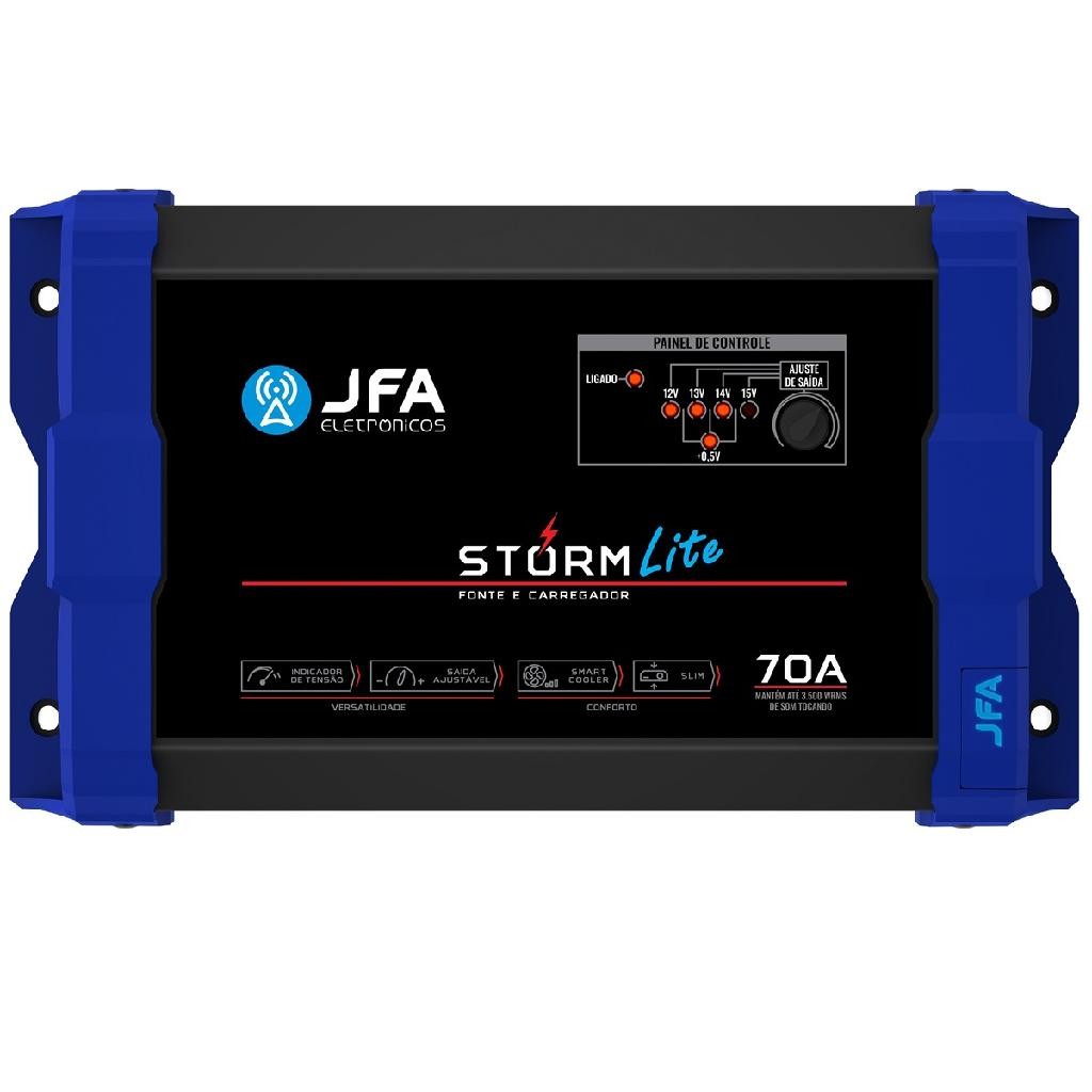 ##Carroussel Apresenta## As Fontes e Carregadores JFA são referência em potência e tecnologia para carregar baterias automotivas e garantir máxima performance ao som do seu carro. A Fonte e Carregador Storm Lite JFA é a escolha ideal para quem busca alimentação eficiente com ótimo custo-benefício. Com saída ajustável de 12V a 15,2V, ela oferece a exclusiva função de equalização dos vasos internos da bateria. Diferenciais: - Saída ajustável de 12V a 15,2V para melhor desempenho da bateria. - Indicador de tensão com voltagem de até 15,2V. - Smart Cooler: ventilação inteligente com controle dinâmico por PWM. - Design Slim: compacto e moderno. Especificações Técnicas: Entrada: 90 a 140Vac / 170 a 240Vac (Bivolt Automático) Consumo com máxima carga: 1050W Corrente máxima de saída carga: 70 Amperes Tensão de saída ajustável: 12 a 15.2Vac* Smart Cooler: Controle dinâmico por PWM Proteções: Excesso de carga / Curto na saída / Temperatura Dimensões L x A x P (mm): 259 x 151 x 58 Peso kg: 1,440 #APLICAÇÃO# - Caixa bob esponja - Caixa home residencial - Caixa ativa - Caixa trio - Som residencial, escritório, comércio, som ambiente, etc. - Som automotivo - Caixas de propaganda de volante