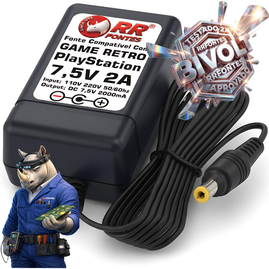 PLAYSTATION1 Fonte Compatível Com PlayStation 1 One Slim Psone Play 1 ps1 Fabricante; RRFONTES Modelo; COMPATÍVEL Marca; RRFONTES Garantia; 90 DIAS pelo vendedor Fotos; MERAMENTE ILUSTRATIVAS, geradas por inteligência artificial Modelo alfanumérico; SCPH-112, SCPH-113, SCPH-114, SCPH-115 Conector: Diâmetro externo de 4,8mm e interno de 1,7mm Modelo do plug; 90° OU 180° depende de estoque no dia do envio DC 7,5V 2000mA - Bivolt Atende os seguintes modelos; SCPH-100: Modelo japonês (NTSC-J). SCPH-101: Modelo americano/norte-americano (NTSC-U/C). SCPH-102: Modelo europeu/australiano (PAL). SCPH-103: Modelo asiático. SCPH-10x: PS-One, o pequeno branco Compatível Com Playstation Sony RRFONTES ELETRO-ELETRONICOS Input; 110V 220V 50/60hz Output; DC 7,5V 2000mA Video Game, PSone, PlayStation, slim, Playstation One, Playstation Slim, Playstation, Play 1, Psone, Sony ps1,