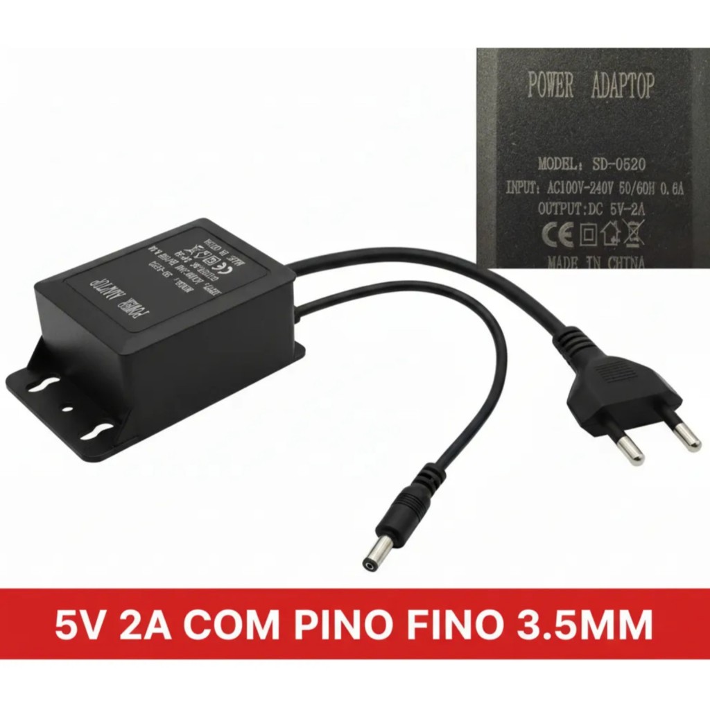 Fonte 12v 2A com pino 3,5mm saida de 5 volts, 2000mAh Fonte resistente a agua se instalado na posição vertical, não pode ser mergulhada em agua a fonte é bivolt automática, funciona tanto em 110v quanto 220v temos outras versões anunciadas, como as versões de pino diferente, como tambem de cor ou potencia diferente