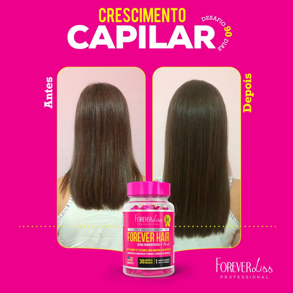 O Forever Hair da Forever Liss é um suplemento de vitaminas 100% natural ultra concentrado, que atua de dentro para fora, proporcionando mais força e crescimento acelerado aos fios. Esse poderoso complexo vitamínico nutre os cabelos, fortalece a fibra capilar e estimula um crescimento saudável e rápido dos fios. Além disso, também promove o crescimento e fortalecimento das unhas, sem causar ganho de peso. Indicação: O Forever Hair é indicado para cabelos com pouco crescimento, queda capilar, unhas fracas e quebradiças. O produto é indicado para casos de queda e falta de crescimento capilar causados pela falta de vitaminas. Se o motivo da queda for esse, os resultados podem ser positivos. No entanto, se a queda for causada por outros motivos, como genética ou estresse, o suplemento não resolverá, sendo importante investigar o caso com um profissional. Sugestão de uso: Ingerir 1 cápsula, 1 vez ao dia, preferencialmente após a principal refeição. Produto indicado para o grupo populacional acima de 19 anos. Caso tenha menos de 19 anos, consulte seu médico antes do uso. Contém: 01 - Frasco do TratamentoCapilar Forever Hair, com 30 cápsulas Principais dúvidas: 01. Gestantes e Lactantes Podem utilizar o Forever Hair? R. Este produto não deve ser consumido por gestantes, lactantes e crianças. 02. A partir de qual idade pode tomar o Forever Hair? R. O Forever Hair é indicado para o grupo populacional acima de 19 anos. Menores de 19 anos devem consultar um médico antes de utilizar o produto. 03. Em quanto tempo começo a ver os resultados do Forever Hair? R. Nos primeiros dias de uso, você já pode perceber uma diminuição da queda, fios mais fortes, brilhantes e resistentes. Recomendamos pelo menos 3 meses de tratamento para perceber fios novos, crescimento acelerado e unhas mais fortes. Os resultados variam de acordo com cada organismo. 04. Por quanto tempo posso tomar o Forever Hair? R. O suplemento pode ser tomado continuamente até se alcançar o resultado desejado. 05. Qual o melhor horário para tomar o Forever Hair? R. Recomendamos o uso após a sua principal refeição. 06. O Forever Hair corta o efeito do anticoncepcional? R. O Forever Hair é um tratamento natural à base de vitaminas e minerais, não interferindo nos níveis hormonais e, portanto, não afetando a eficácia dos tratamentos contraceptivos. 07. Forever Hair funciona mesmo? R. É indicado que consulte seu médico antes do uso do mesmo! Se os motivos da queda ou falta de crescimento for por falta de vitaminas, terá resultados, sim! Mas pode ser por diversos motivos, como genética, estresse, pós-parto, entre outras que o complemento não irá resolver e é ideal que você investigue o caso.