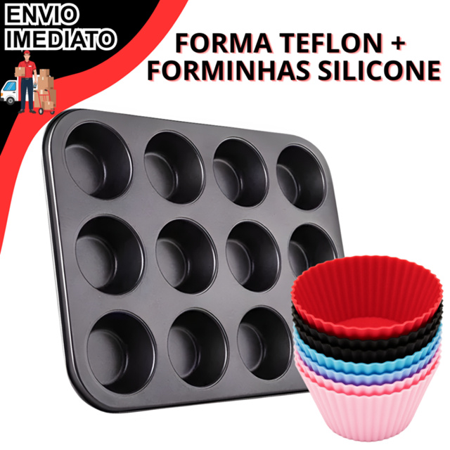 Forma Assadeira Teflon Antiaderente 12 Cavidades + Forminha Cupcakes Silicone Bolinhos Muffins Pão De Queijo Cake