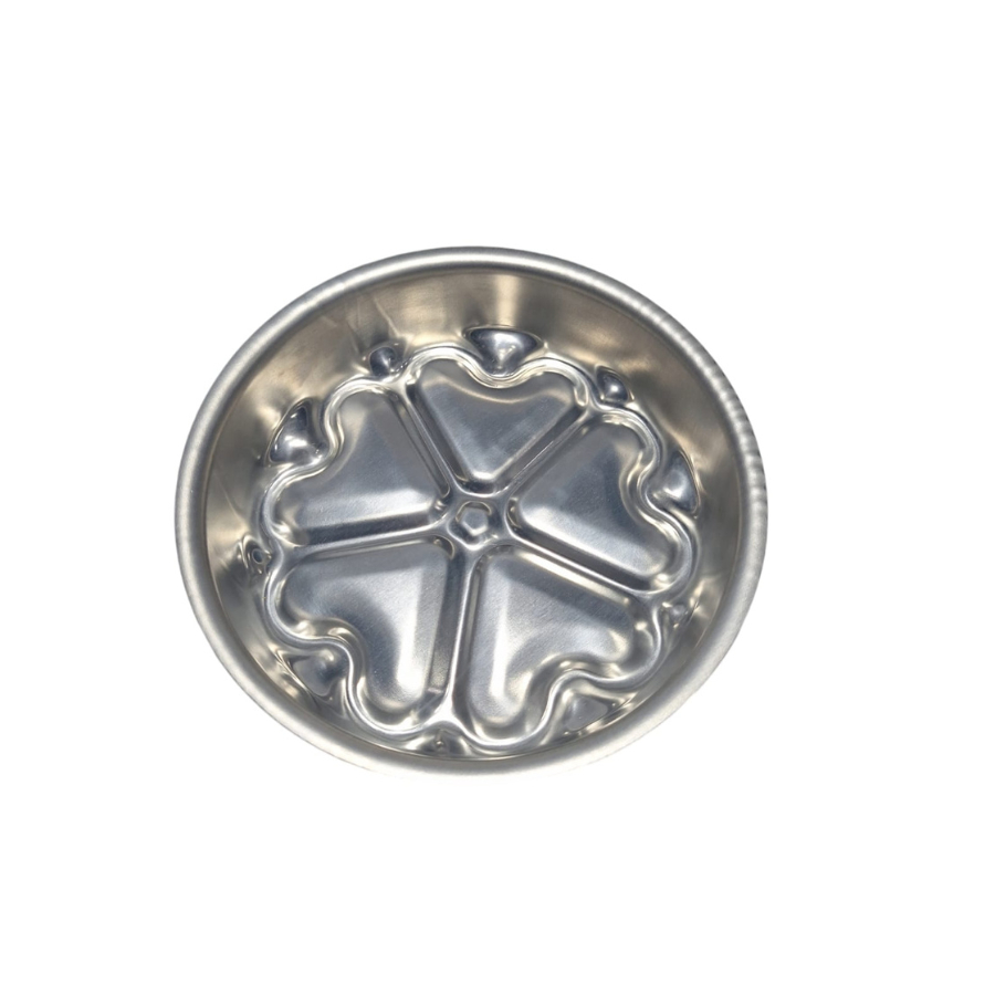 FORMA BALLERINE 5 CORAÇÕES * Dimensões: 18X4,5 (diâmetro x altura) A Forma Ballerine Decorada é ideal para bolos sofisticados devido ao seu formato , o bolo desenforma de forma rápida e precisa e um simples bolo consegue atrair um charme diferenciado. O bolo cabe na embalagem Galvanotek G32
