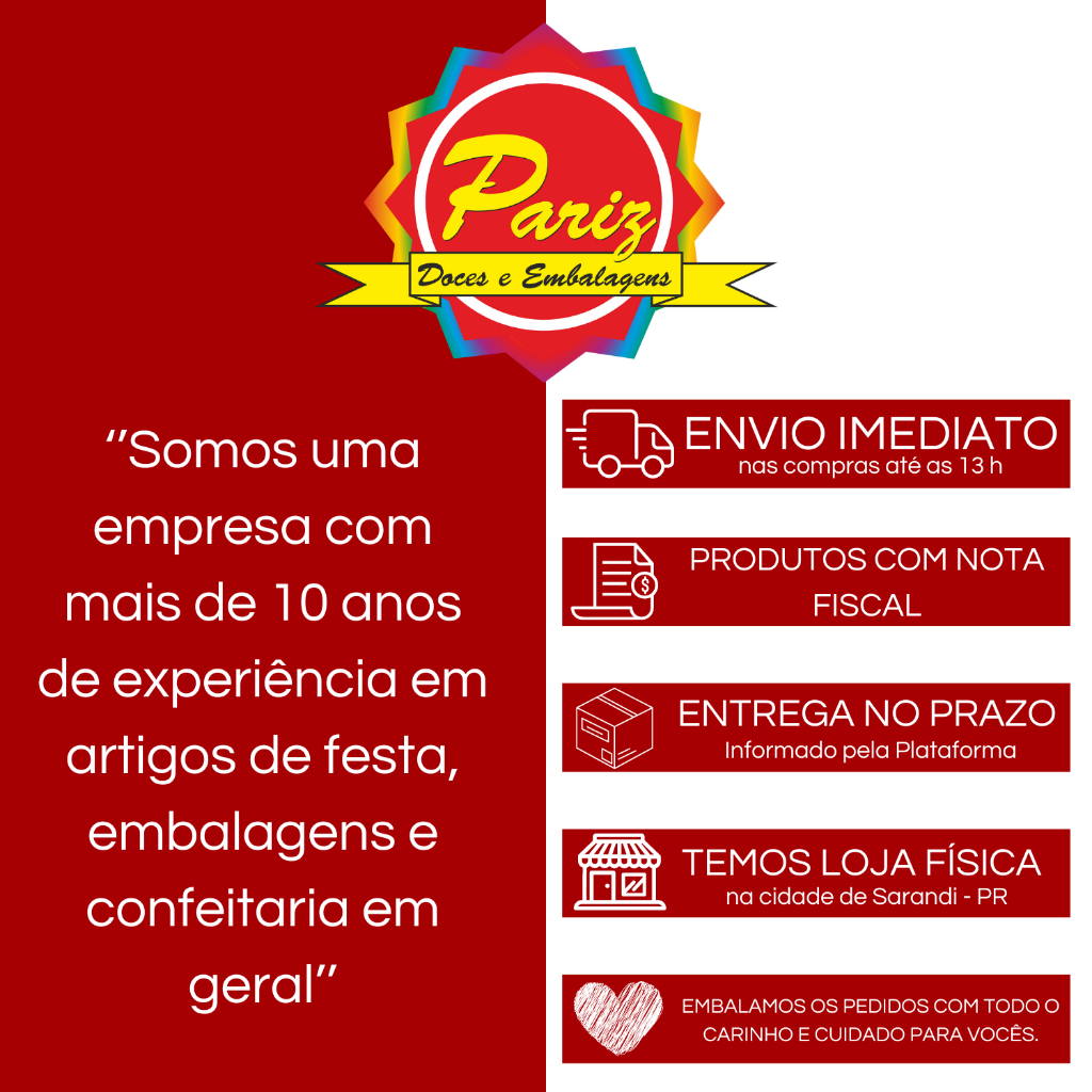 Vendido pela loja Pariz Doces e Embalagens e 5 produtos catalogados aqui no SuperOfertas Brasil. Esta loja ocupa a 52.876ª colocação no ranking de lojas por volume total de vendas registradas (entre 138.316 lojas).