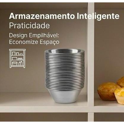 Aço Premium: Não descasca e não solta resíduos nos alimentos. Higiene total para sua cozinha. Bordas Arredondadas: Mais segurança no manuseio, evitando cortes ou acidentes durante o preparo ou lavagem. Versatilidade Total: Perfeitas para empadas, muffins, cupcakes, pães de queijo, petit gateau e muito mais. Design Inteligente: São totalmente empilháveis, ocupando o mínimo de espaço no seu armário. Durabilidade: Um investimento para a vida toda. Diferente das formas de alumínio simples, o Aço mantém o brilho e a estrutura por muito mais tempo. DICAS DE USO E CONSERVAÇÃO Lave com esponja macia e detergente neutro para manter o brilho. Podem ser levadas à máquina de lavar louças. Para um desenforme perfeito, unte levemente conforme a necessidade da sua receita. 🚚 ENVIO IMEDIATO PARA TODO O BRASIL! Garanta já o seu kit e eleve o nível das suas produções culinárias!