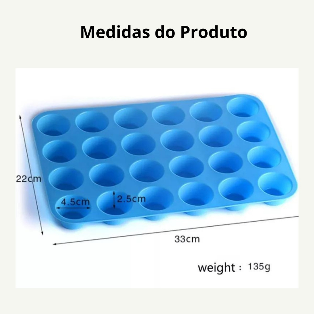 Forma Silicone Cupcake Muffin 24 Cavidades • Forma produzida em silicone completamente antiaderente, dobrável e moldável. Facilita o processo de desenformar suas receitas. Indicada para fazer muffins, cupcakes, mini cheesecakes, paes de queijo, etc. Suporta temperaturas elevadas • Material de alta qualidade: Silicone avançado (BPA Free) ,suporta altas temperaturas (de -50° C até 220° C), muito macio, seguro, confiável e de fácil limpeza. Pode ser levada ao freezer, forno ou micro-ondas. • Tamanho da forma: 33x22cm, cada cavidade contem 4,5cm x 2,5cm Não esqueça de selecionar a cor desejada antes de finalizar a compra! Qualquer dúvida entre em contato conosco!