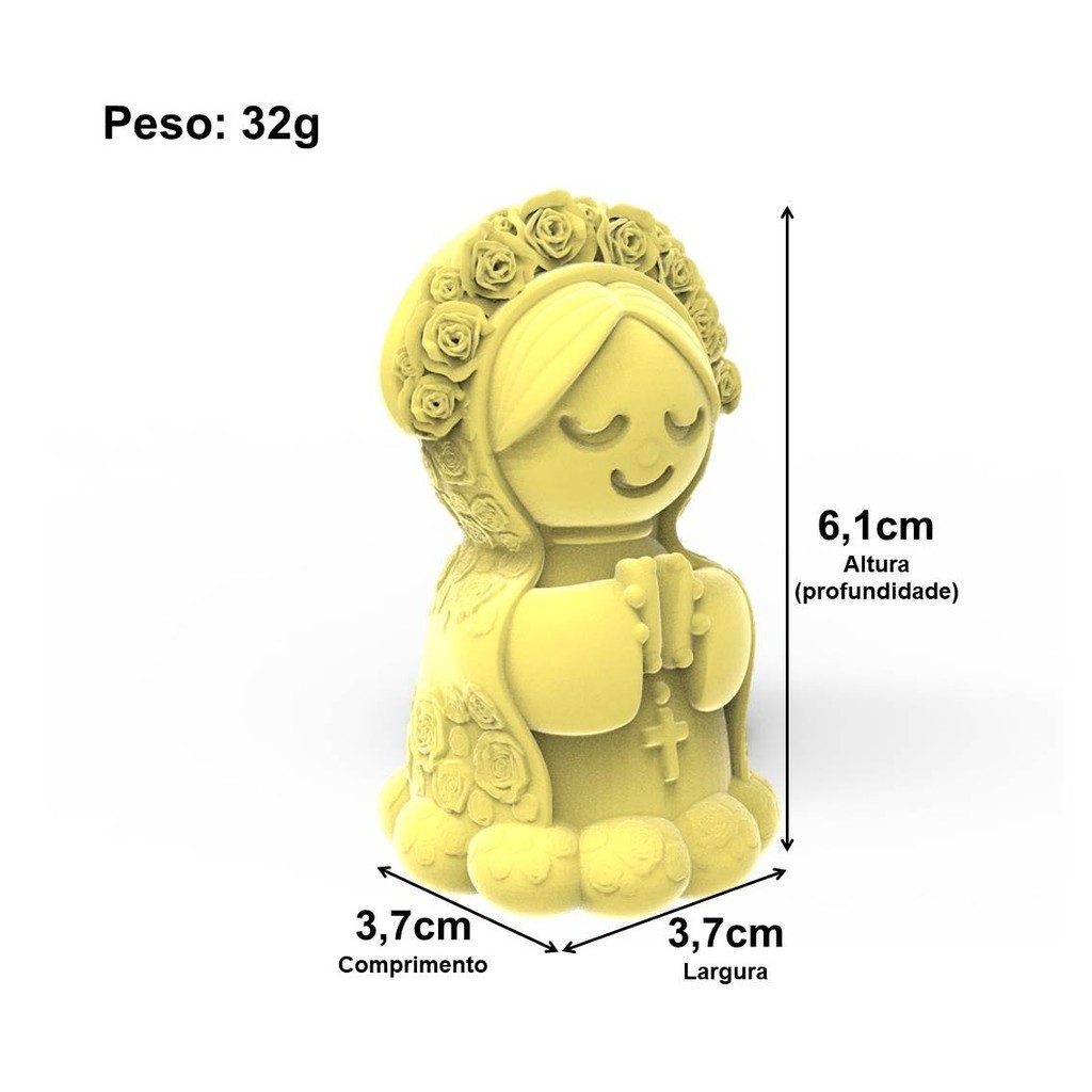 Desperte sua devoção com nossos moldes artesanais da Nossa Senhora com terço. Cada molde é cuidadosamente elaborado para capturar a pureza e a ternura da Virgem Maria, permitindo que você crie suas próprias representações sagradas com facilidade. Com detalhes delicados e uma qualidade incomparável, nossos moldes oferecem uma maneira única de expressar sua fé e devoção, adicionando um toque sagrado e inspirador ao seu ambiente. Reze, medite e celebre sua espiritualidade de forma única com nossos exclusivos moldes da Nossa Senhora com terço. CARACTERÍSTICAS DE PRODUÇÃO FINAL: Medidas Aproximadas: 3,7cm Largura x 3,7cm Comprimentox 6,1cm Altura (Profundidade) Peso Aproximado: 32gr (Glicerina) Detalhes sobre esse Molde Silicone Este Molde Silicone temos um diferencial nossa matriz dos moldes é produzida a partir de impressão 3D. Usamos material biodegradável e após a impressão as peças passam por acabamento desenvolvido por nós. Abaixo listamos algumas recomendações: 1- Recomendamos que espere seu sabonete esfriar por 4 Horas em temperatura ambiente antes de desinformar. 2 - Se houver pressa coloque no congelador por no máximo 15 minutos antes de desinformar. 3 - Lembre-se de colocar a forma sobre algo plano para movimentar a forma sem deformá-la. 4 - Para uma melhor limpeza, lave com água morna e deixe secar naturalmente. 5 - Caso necessite vire o Molde Silicone e dê umas batidinhas antes de guardá-lo para remover qualquer resíduo de água. Concluindo nosso molde é produzido com silicone de cor branca de ótima qualidade e passa por processo de vácuo. O vácuo retira todas as bolhas de ar do silicone, o que torna o silicone mais resistente e durável. Estamos sempre trazendo novidades para o mercado da saboaria artesanal, esperamos fazer com que nosso trabalho aumente as possibilidades de ganhos para todos que trabalham com sabonete artesanal. Quanto mais opções de moldes disponíveis no mercado consequentemente será melhor para todos.