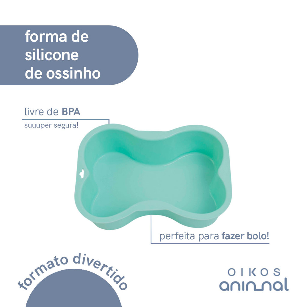 "conheça a forma de silicone para bolo em formato de osso da oikos animal! a forma é perfeita para o seu pet se deliciar com receitinhas feitas por você em um formato super divertido! não deixa gosto e nem cheiro após a lavagem, é fácil de desenformar e pode colocar no forno até 220° e no freezer! além disso, é versátil: faça bolos, gelatinas ou o que quiser! é de silicone. para limpar, basta lavar em água corrente com detergente e secar em seguida! leve diversão e praticidade para a rotina com seu pet! medidas: comprimento: 17cm largura: 12,5cm altura: 5cm"