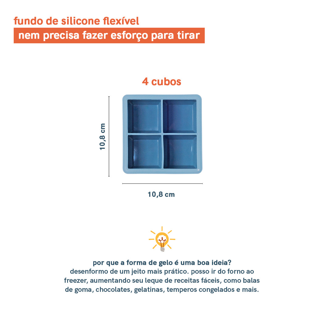 Essa é a forma de silicone para gelo quadrado da OIKOS, ou para os íntimos, forma-do-que-você-quiser! Versátil: por ser de silicone livre de BPA, consegue se adaptar tanto no freezer quanto no forno, aumentando seu leque de receitas fáceis - como chocolates, gelatinas, balas de goma, temperos congelados e mais. Fácil de desenformar: seu material maleável ajuda muito nisso - recomendamos untar nos três primeiros usos e nunca mais! Formato quadrado: pensado para cubos maiores - aquela medida boa para fazer alguns bolinhos individuais. Higiênico: o silicone não retém cheiros, manchas e nem prolifera bactérias. Fácil de lavar: mistura de água morna e detergente neutro, utilizar laco macio da esponja - e também pode ir na lava-louças. cotidica: dá para ir além do gelo e preparar receitas salgadas como sushi, ravióli de queijo e enroladinho de calabresa! ou se preferir, dá para fazer alguns cosméticos naturais e congelar - sua casa, suas regras.