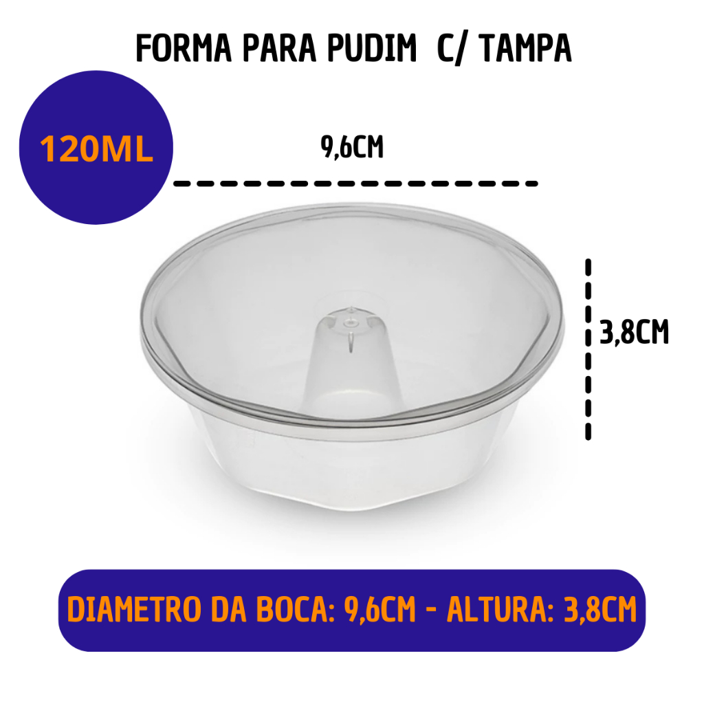 Forma de Pudim 120ml Com Tampa, Com Variação de 50 Unidades - Plastilânia * PODE IR AO FORNO(20 minutos a 180 graus) EM BANHO MARIA E AO MICROONDAS (4 a 6 minutos em potência 90)* Diâmetro de boca: 9,6cm / Altura: 3,8cm Capacidade: 120mL Material: Plástico Descartável e Reciclável Produto Não Tóxico e Sem Bisfenol A. Aplicação: Vai ao forno convencional em banho maria, micro-ondas e freezer. gepackembalagens.