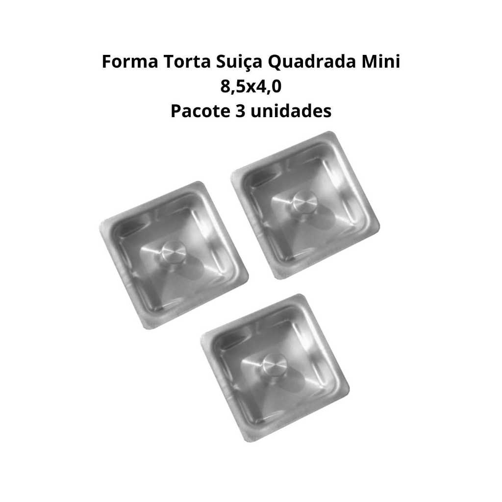 Forma Mini Torta Suíça Quadrada Medidas: Boca 8,5cm x Fundo 8,0cm x Altura 4,0cm Material: Alumínio De Ótima Qualidade Com Certificado (INMETRO) Marca: Roldan 3 Peças