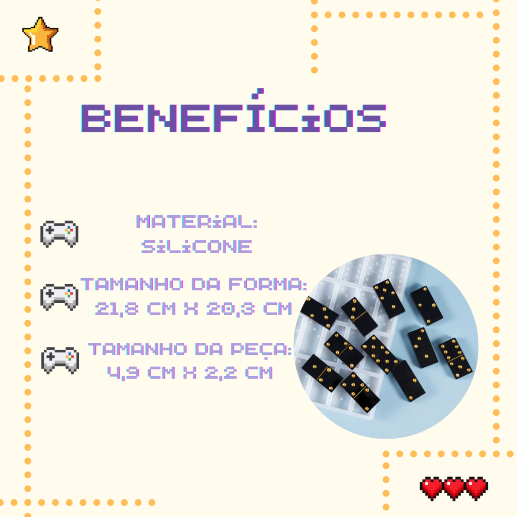 Crie seu próprio jogo de dominó personalizado com esta forma de silicone transparente com 28 cavidades. Ideal para trabalhos em resina e outros materiais artesanais, proporciona acabamento detalhado, fácil desenforme e alta durabilidade. Perfeita para quem busca qualidade, praticidade e um resultado profissional no artesanato. O QUE VOCÊ IRÁ RECEBER? 01 Forma de Silicone para Dominó com 28 Cavidades 01 Nota Fiscal BENEFÍCIOS ALTA DURABILIDADE Produzida em silicone resistente, pode ser dobrada sem deformar ou danificar. DESENFORME FÁCIL Material totalmente antiaderente que facilita a remoção das peças sem quebrar ou marcar. ACABAMENTO PROFISSIONAL Cavidades com marcações em relevo que reproduzem fielmente as peças de dominó. VERSATILIDADE DE USO Compatível com resina e outros materiais artesanais, suportando temperaturas de -40°C a 210°C. CARACTERÍSTICAS DO PRODUTO Material: Silicone transparente Quantidade de cavidades: 28 (jogo completo) Tamanho aproximado da forma: 21,8 cm x 20,3 cm Tamanho aproximado de cada peça: 4,9 cm x 2,2 cm Profundidade aproximada: 0,8 cm Produto disponível para pronta entrega PERGUNTAS FREQUENTES Tem o produto à pronta entrega? Sim. Todos os nossos produtos estão disponíveis para envio imediato. Em quanto tempo o produto é enviado? Após a confirmação do pagamento, o envio é realizado em até 24 horas úteis. O molde pode ser usado apenas com resina? Não. Apesar de ser ideal para resina, também pode ser utilizado com outros materiais compatíveis com silicone. É fácil de limpar? Sim. O silicone é de fácil limpeza e pode ser reutilizado diversas vezes sem perder a qualidade. Possui garantia? Sim. Produto com garantia contra defeitos de fabricação e suporte pós-venda para qualquer necessidade. Garanta agora sua forma de dominó e produza peças personalizadas com excelente acabamento e qualidade profissional! palavras-chave: forma, molde, silicone, resina, decorar, jogo, dominó