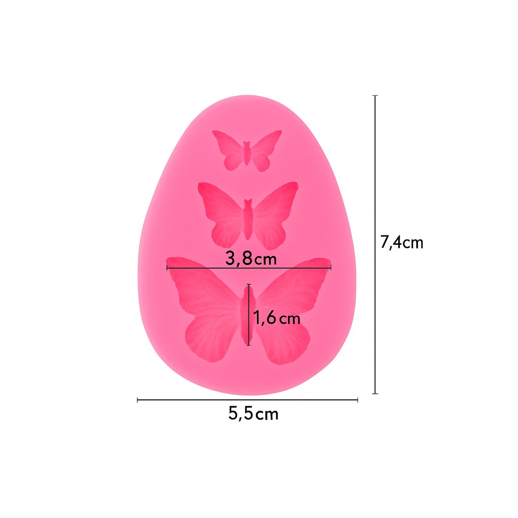 Molde de Silicone Borboletas – 3 Cavidades Molde de silicone em formato oval, com três cavidades em relevo de borboletas em tamanhos diferentes, ideal para trabalhos artesanais e confeitaria criativa. Fabricado em silicone flexível de alta qualidade, permite fácil desenforme sem danificar os detalhes, garantindo um acabamento preciso e delicado nas peças produzidas. Dimensões do molde: Altura: 7,4 cm Largura: 5,5 cm Dimensões aproximadas das borboletas: Borboleta maior: Largura: 3,8 cm Altura central: 1,6 cm As outras borboletas seguem proporção menor, conforme o design do molde. Indicações de uso: - Produção de velas artesanais - Sabonetes decorativos - Resina e artesanato em geral - Chocolate, pasta americana e biscuit Características: - Material flexível e resistente - Fácil de limpar - Reutilizável - Suporta variações de temperatura conforme o material utilizado Ideal para artesãos, confeiteiros e criadores que buscam detalhes delicados e acabamento profissional em suas peças.