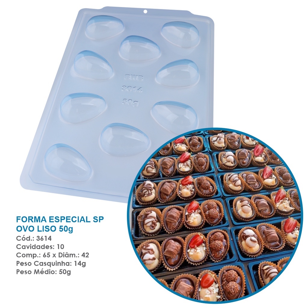 Forma especial com silicone (3 partes), ideal para a produção de ovo de páscoa de chocolate com muito mais praticidade, precisão e agilidade. KIT COM 3 PEÇAS 2 RÍGIDAS 1 PELÍCULA DE SILICONE DIVERSOS TAMANHOS: 10G : COD 3673 Cavidades: 20 /Dimensões (mm): Comp.: 35x Diâm.: 22,5/ Peso Casca: 3,5g Peso médio : 10g 30 G : COD 3613 Cavidades: 14 /Dimensões (mm): Comp.: 55 x Diâm.: 44 /Peso casca: 9g Peso médio: 30g 50 G: COD 3614 Cavidades: 10/ Dimensões (mm) :Comp.: 65 x Diâm.: 42 /Peso casca: 14g Peso médio:50g 100G : COD 3616 Cavidades: 5/ Dimensões (mm): Comp.: 98 x Diâm.: 68 /Peso Casquinha: 38g Peso Médio: 100g 150G : COD 3616 Cavidades: 5 /Dimensões (mm): Comp.: 109 x Diâm.: 70 /Peso Casquinha: 60g Peso Médio: 150g 250 G: COD 3614 Cavidades: 3/ Dimensões (mm) :Comp.: 137 x Diâm.: 85 /Peso casca: 98g Peso médio:250g 350G: COD 3618 Cavidades: 2 /Dimensões (mm): Comp.: 151 x Diâm.: 90 /Peso Casquinha: 140g Peso Médio: 350g 500G: COD 3618 Cavidades: 2/ Dimensões (mm): Comp.: 186 x Diâm.: 118 /Peso Casquinha: 165g Peso Médio: 500g 750G: COD 3620 Cavidades: 1 /Dimensões (mm): Comp.: 197 x Diâm.: 130 /Peso Casquinha: 185g Peso Médio: 750g 1kg: COD 3621 Cavidade: 1 /Dimensões (mm): Comp.: 209 x Diâm.: 150 /Peso Casquinha: 310g Peso Médio: 1Kg