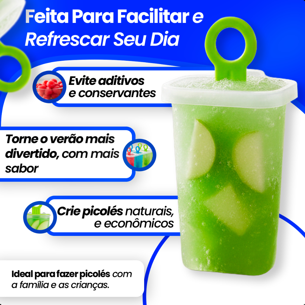 🍧 Molde para Picolé Caseiro – 6 Cavidades com Palitos Coloridos Transforme seu freezer em uma verdadeira fábrica de sabor! Com este kit prático, você pode fazer até 6 picolés de uma só vez, criando combinações deliciosas e naturais para toda a família. Feito em plástico resistente e reutilizável, é fácil de limpar e ideal para preparar sobremesas saudáveis, sem corantes ou conservantes. 🧊 Benefícios: ✅ Crie picolés naturais e econômicos em casa ✅ Evite aditivos e conservantes, garantindo mais saúde ✅ Plástico durável e fácil de limpar, feito para durar muitos verões ✅ Compatível com freezer, micro-ondas e forno ✅ 6 cavidades práticas para preparar diferentes sabores de uma só vez 📦 Conteúdo da Embalagem: 1 molde com 6 cavidades 6 palitos coloridos reutilizáveis 💡 Dica: Adicione frutas, sucos ou iogurte e crie picolés irresistíveis para adultos e crianças!