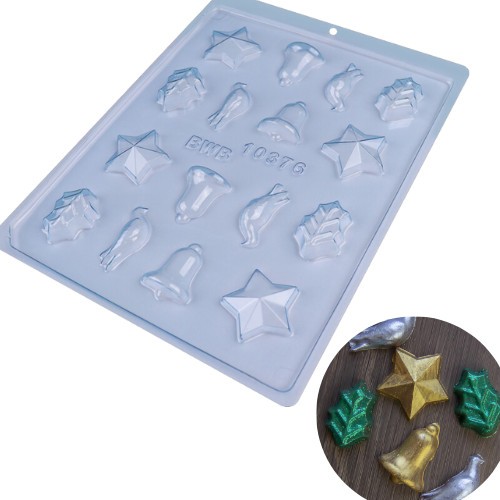 BOMBOM ENFEITE DE NATAL APLIQUE / ARABESCO | Forma Simples Tradicional | NATAL | CÓD: 10376 Ideal para produção de chocolates com muita praticidade. Abaixo mais informações do produto: Cavidades: 16 Sino: 3,5cm Folha: 3,5 Pomba: 4cm Estrela: 3,5 Unidades pacote: 10 Modelo: Forma Simples