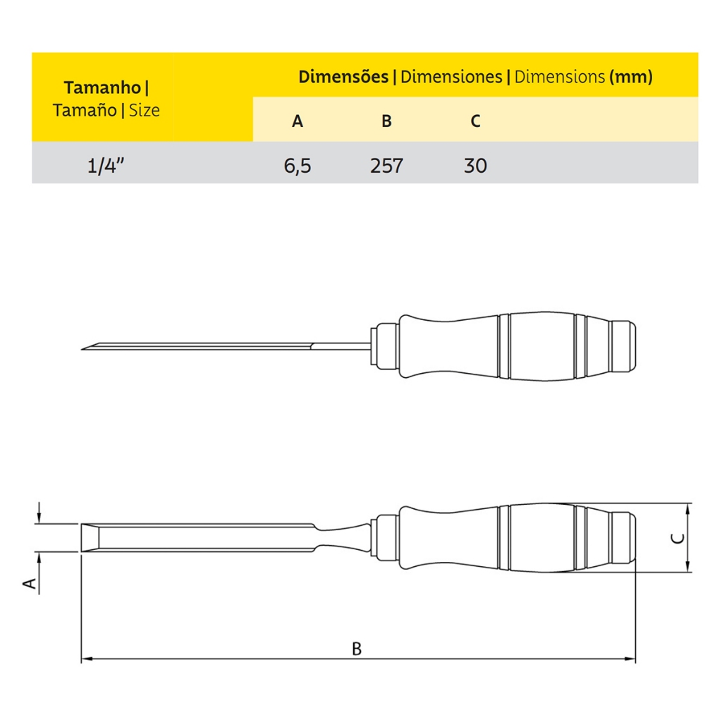 Formão Chanfrado 1/4" Tramontina Master Cabo de Madeira 43330/101 Descrição: - Carpinteiros e marceneiros contam com a ajuda dos formões Tramontina na hora de fazer rebaixos, entalhes, cortes e encaixes; - A ferramenta certa para você que trabalha na construção civil ou com pequenos reparos. Informações Gerais: - Lâmina em aço cromo vanádio temperado e lixado; - Lâmina chanfrada e polida; - Cabo de madeira ergonômico envernizado; - As ferramentas são submetidas a testes de aplicação prática para garantir sua resistência mecânica em uso intenso; - É aplicada uma camada de verniz ou pintura anticorrosiva sobre as lâminas para garantir uma maior vida útil da ferramenta; - As ferramentas são produzidas e testadas conforme normas específicas. Especificações Técnicas: - Marca: Tramontina Master; - Modelo: 43330/101; - Peso: 0,10 kg; - Largura do cabo (C): 3 cm; - Largura da lâmina (A): 6,5 cm; - Comprimento total (B): 25,7 cm. Itens Inclusos: - 1 Formão Chanfrado 1/4" Tramontina Master Cabo de Madeira 43330/101.