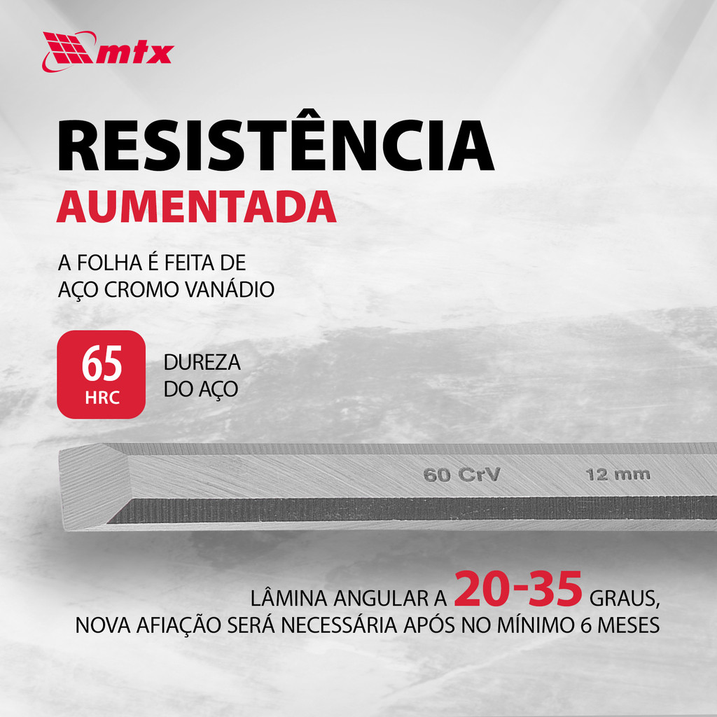 Formão MTX 245079: A Ferramenta de Precisão para Carpintaria e Marcenaria O Formão MTX 245079, com sua lâmina de 12 mm de largura e cabo de borracha de dois componentes, é uma ferramenta essencial para os profissionais e entusiastas da carpintaria e marcenaria. Ideal para a produção de móveis, este formão permite realizar cortes de rebaixos, formar encaixes precisos, limpar pinos e ninhos, além de remover chanfros com eficiência e precisão. Projetado para suportar golpes de martelo, o batente de metal incorporado assegura proteção contra deformações, tornando-o uma escolha robusta para uso profissional e doméstico. Vantagens e Características: Alta Resistência: A lâmina, forjada a partir de aço cromo-vanádio de alta qualidade, oferece uma resistência superior. Este material confere à ferramenta uma durabilidade excepcional, permitindo que ela mantenha sua integridade mesmo sob as demandas rigorosas do trabalho diário. Manutenção Prolongada das Propriedades de Corte: Com uma dureza de 65 HRC ao longo de 70% do comprimento da parte de trabalho da lâmina, o formão mantém sua afiação por um período extenso. A lâmina, afiada como uma navalha e processada na fábrica sob um ângulo de 20-35°, garante cortes limpos e precisos, com a necessidade de afiação repetida surgindo apenas após pelo menos 6 meses de uso regular. Design Bem Pensado: A inclusão de uma haste de metal que passa pelo cabo não apenas reforça a ferramenta, mas também aumenta sua resistência e durabilidade. Esta característica é fundamental para assegurar que o formão possa suportar golpes de martelo sem sofrer deformações, evidenciando um design que prioriza tanto a funcionalidade quanto a longevidade. Operação Confortável: O cabo, composto por dois materiais com inserções de borracha e apoios ergonômicos para os dedos, proporciona uma experiência de uso segura e confortável. Este design previne o escorregamento durante a operação e minimiza a fadiga do usuário, permitindo trabalhos prolongados com menos desconforto. Ideal para Todos os Níveis de Habilidade: Seja você um marceneiro profissional ou um entusiasta de projetos DIY, o Formão MTX 245079 é uma ferramenta indispensável que combina precisão, durabilidade e conforto. Sua capacidade de realizar tarefas complexas com facilidade o torna uma adição valiosa para qualquer kit de ferramentas de carpintaria e marcenaria. Equipado com o Formão MTX 245079, você está preparado para enfrentar uma ampla variedade de projetos, assegurando resultados de alta qualidade com eficiência e conforto. Esta ferramenta não é apenas uma adição prática para sua oficina, mas um investimento na qualidade e na precisão do seu trabalho.