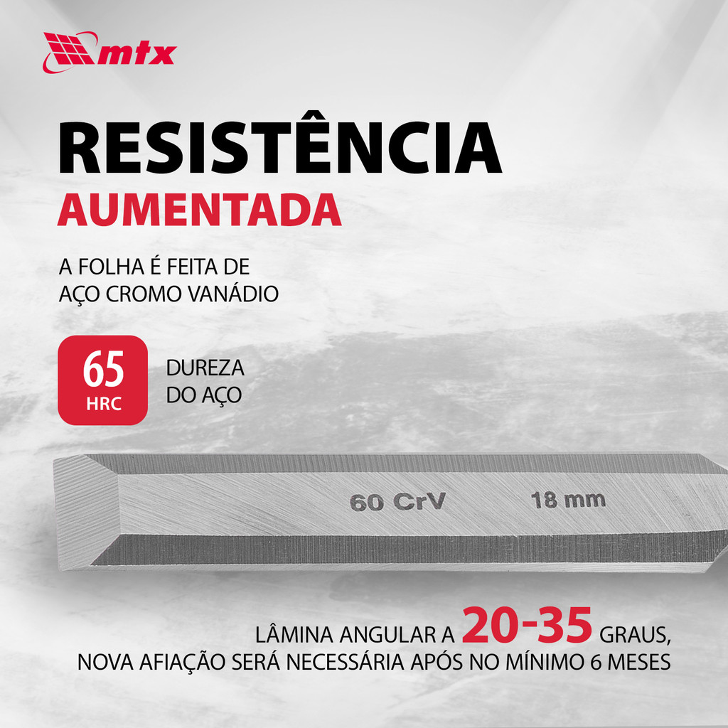 Formão MTX 245139: Inovação e Eficiência em Carpintaria e Marcenaria O Formão MTX 245139, com sua lâmina robusta de 18 mm de largura e um cabo ergonomicamente projetado de borracha de dois componentes, é a ferramenta de escolha para profissionais da carpintaria, marcenaria e entusiastas do faça você mesmo (DIY) dedicados à produção de móveis e outras peças de madeira de alta qualidade. Projetado para executar com precisão uma variedade de tarefas, desde cortar recessos até formar encaixes, limpar pinos e ninhos, e remover chanfros, este formão combina funcionalidade avançada com durabilidade excepcional. Vantagens: Alta Resistência: Forjada em aço cromo-vanádio de liga, a lâmina do Formão MTX 245139 oferece uma resistência superior e uma durabilidade inigualável. Este material de ponta assegura que o formão mantenha sua forma e funcionalidade mesmo sob as demandas mais rigorosas de trabalho. Manutenção Prolongada das Propriedades de Corte: A dureza de 65 HRC ao longo de 70% do comprimento da parte de trabalho da lâmina garante que o formão mantenha sua afiação excepcional por longos períodos. Afiada como uma navalha e processada na fábrica sob um ângulo de 20-35°, a lâmina requer reafiação mínima, apenas a cada 6 meses ou mais, dependendo do uso. Design Bem Pensado: A construção do formão inclui uma haste de metal que atravessa o cabo, aumentando significativamente sua resistência e durabilidade. Este design inteligente assegura que o formão possa suportar golpes de martelo sem sofrer deformações, tornando-o uma ferramenta confiável para qualquer projeto. Operação Confortável: O cabo de dois componentes, com inserções de borracha e apoios ergonômicos para os dedos, oferece uma pegada segura e confortável. Esse design previne o escorregamento e minimiza a fadiga durante o trabalho prolongado, permitindo uma experiência de uso mais agradável e eficiente. Ideal para Profissionais e Amadores: O Formão MTX 245139 é uma ferramenta versátil e indispensável que se destaca tanto em ambientes profissionais quanto em projetos caseiros. Sua combinação de precisão de corte, durabilidade e conforto de uso o torna uma adição valiosa para qualquer conjunto de ferramentas de carpintaria e marcenaria. Com o Formão MTX 245139, você está equipado para enfrentar uma ampla gama de tarefas com confiança e eficácia, garantindo resultados de alta qualidade que atendem às expectativas dos mais exigentes profissionais e entusiastas do DIY. Este formão não é apenas uma ferramenta prática, mas um investimento na qualidade e precisão do seu trabalho.