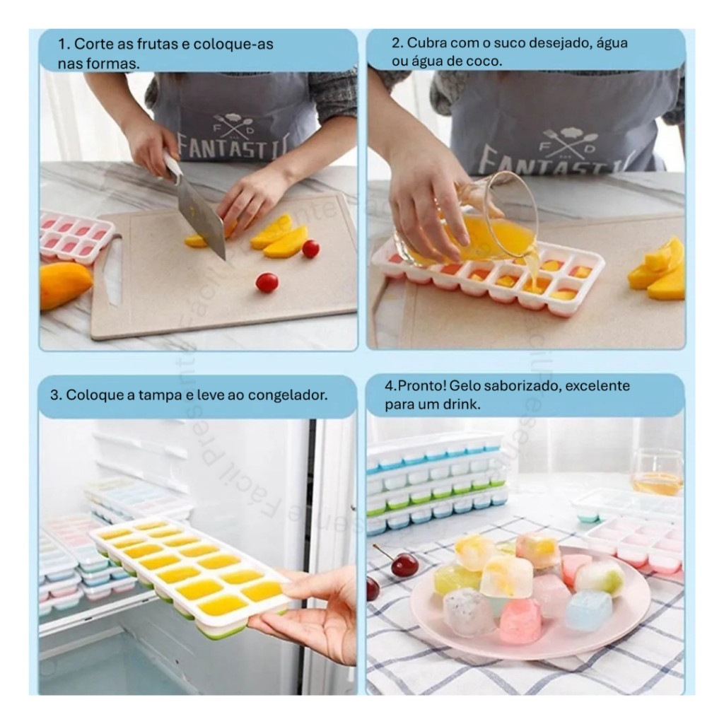 Formas de Gelo com Tampa Rígida Fundo Silicone Flexível Retangular 14 Cubos