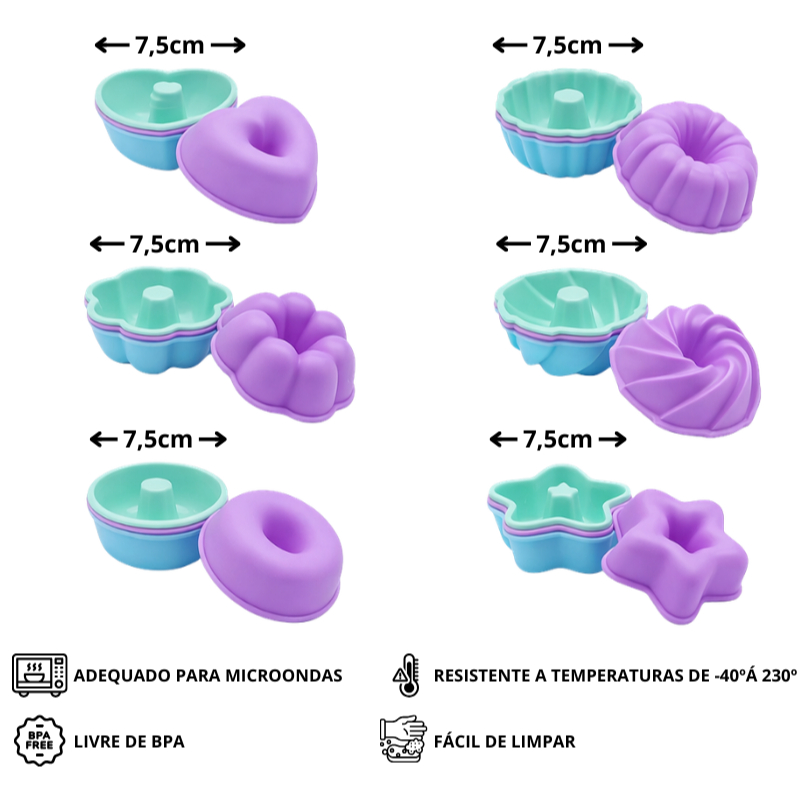 🎨 Cores sortidas enviadas conforme disponibilidade em estoque. 📐 Confira sempre as medidas nas imagens antes de comprar. 🍩 KIT Formas de Silicone para Bolo e Pudim – Diversos Modelos 🍮 Deixe suas receitas ainda mais fofas e divertidas com essas lindas formas de silicone! 🧁 Perfeitas para bolinhos, pudins, donuts e muito mais! Super práticas, resistentes e fáceis de usar! 💪✨ 📦 A embalagem compõe um kit com 12 unidades sendo 2 unidades de cada modelo (total 12 unidades) 🌟 Estrela - 📏 7,5cm(L) x 2,6cm(A) 🍩 Donuts - 📏 7,5cm(L) x 2,6cm(A) ❤️ Coração - 📏 7,5cm(L) x 2,6cm(A) 🌀 Espiral - 📏 7,5cm(L) x 2,6cm(A) 🧁 Bolinho Ondulado - 📏 7,5cm(L) x 2,6cm(A) 🍰 Bolinho de Gomos - 📏 7,5cm(L) x 2,6cm(A) ✨ Características: -Temperatura suportada de -40°C a 230°C -Resistente ao forno, micro-ondas e air fryer -Livre de BPA -Fabricado em silicone de grau alimentício -Flexível, dobrável e moldável -Antiaderente, lavável e reutilizável -Fácil de desenformar e limpar -Perfeito para: Bolinhos, doces, chocolates, gelatinas e muito mais! 📦 Informações adicionais: ✅ Garantia de 90 dias ✅ Produtos a pronta entrega ✅ Envio rápido ✅ Todos os itens são verificados antes do envio